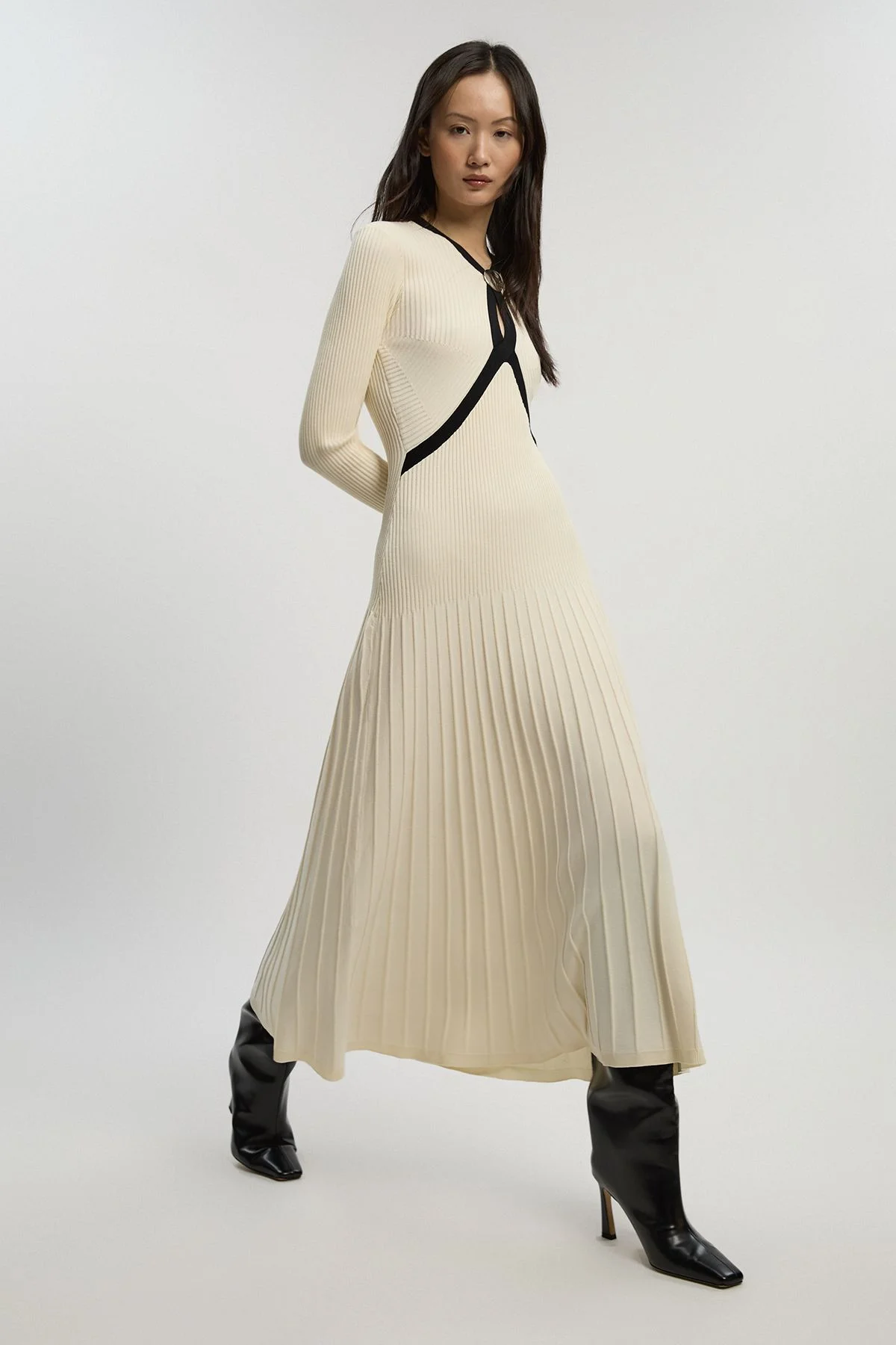 - Elegant rib knit construction with directional panelling for a flattering silhouette - Sophisticated V-neckline with decorative hardware detail - Long sleeves for versatile seasonal styling - Full pleated skirt creates graceful movement and volume - Midi length design offering contemporary sophistication This Karen Millen rib knit midi dress exemplifies refined daywear with its thoughtful design details. The fitted bodice features directional ribbing that contours the figure beautifully, whilst the pleated full skirt creates a feminine silhouette with graceful movement. Style with knee-high boots as shown for an effortlessly chic autumn ensemble, or pair with trainers and an oversized cardigan for casual weekend brunches. The hardware detail at the neckline adds a distinctive touch that reflects the brand's attention to craftsmanship. Perfect for family gatherings or coffee dates, this versatile piece can be dressed down with a denim jacket for daytime or accessorised with statement jewellery for evening drinks. The midi length offers practicality without compromising on style, making this a wardrobe staple for the discerning woman. Product Details & Care Main: 53% Polyamide, 47% Viscose. Machine wash. Due to the delicate nature of this fabric, care must be taken with jewellery and rough surfaces. Models wears UK size Small. Models height approx: 5"9. Length approx 119cm.
