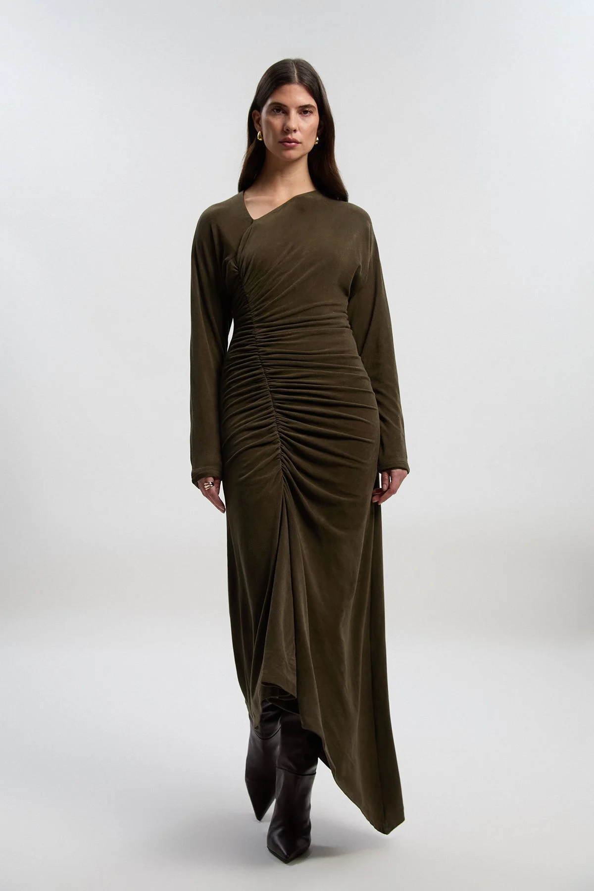 - Asymmetric neckline creates a distinctive, contemporary silhouette - Elegant ruched detailing across the bodice adds texture and visual interest - Brushed textured jersey fabric offers exceptional comfort with a luxurious feel - Midi length with subtle asymmetric hem for a modern twist - Long sleeves provide versatility for transitional weather styling This Karen Millen midi dress masterfully combines sophistication with contemporary design through its distinctive ruched detailing and asymmetric neckline. The brushed textured jersey fabric drapes beautifully while offering day-long comfort and a flattering silhouette. Style with pointed heeled boots as shown for an effortlessly chic daytime look, or pair with leather trainers and an oversized cardigan for casual family gatherings. The versatile design works wonderfully for coffee dates, gallery visits or weekend brunches. Add a structured clutch bag and delicate jewellery to enhance the dress's elegant lines. The thoughtful craftsmanship and attention to detail exemplify Karen Millen's commitment to creating pieces that feel both timeless and thoroughly modern - perfect for the woman who appreciates refined daywear with a contemporary edge. Product Details & Care Main: 75% viscose, 20% acrylic, elastane 5%. Model wears UKS Model height 5"'9. Length approx: 143cm