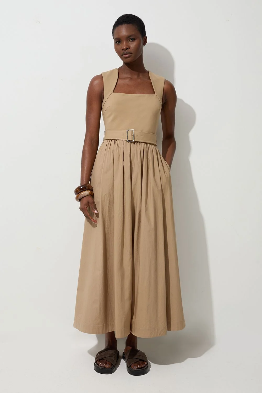 Elevate your occasion wear wardrobe in our midaxi dress, with a fit and flare silhouette, a squared neckline that accentuates the bust, and a belted waistline to cinch the silhouette. Style it with strappy heels for an occasion look that is guaranteed to turn heads wherever you step. Square Neck Jersey Cotton Mix Maxi Dress High Quality Cotton Fabric Squared Neckline Summery Capped Sleeves Flattering Fit and Flare Silhouette Cinched, Belted Waistline Zip Fastening in Back Product Details & Care Main: 67% Viscose/Rayon, 28% Polyamide, 5% Elastane. Skirt: 100% Cotton. Lining: 100% Polyester. Model wears a UK size Small. Models height approx.: 5''9. Centre back length of a S: 130cm