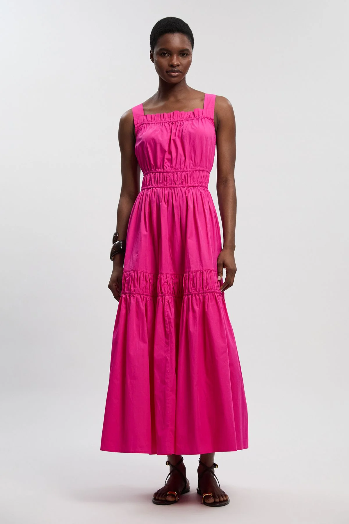 - Crafted from pure cotton for breathable comfort throughout the day - Elegant square neckline with wide straps for a flattering silhouette - Shirred bodice and waistband create a beautifully defined shape - Tiered maxi design with voluminous skirt for graceful movement - Petite-friendly length that sits perfectly at the ankle This charming tiered maxi dress embodies effortless summer style with its relaxed yet refined aesthetic. The shirred detailing across the bodice and waist creates a wonderfully flattering fit that accentuates your natural shape, while the cotton fabric ensures all-day comfort even during warmer weather. Style with leather sandals as shown for casual weekend brunches or garden parties. For a more polished daytime look, add a structured denim jacket and woven tote. The versatile design transitions beautifully from farmers' markets to afternoon tea with friends-simply switch your accessories to match the occasion. This Karen Millen piece demonstrates how contemporary design can maintain a timeless appeal, making it a wardrobe staple that will serve you season after season. Product Details & Care Main: 100% Cotton. Wash at 30. Model wears UK Size 10/ US Size 6. Model height approx: 5"9. Length approx: 135cm