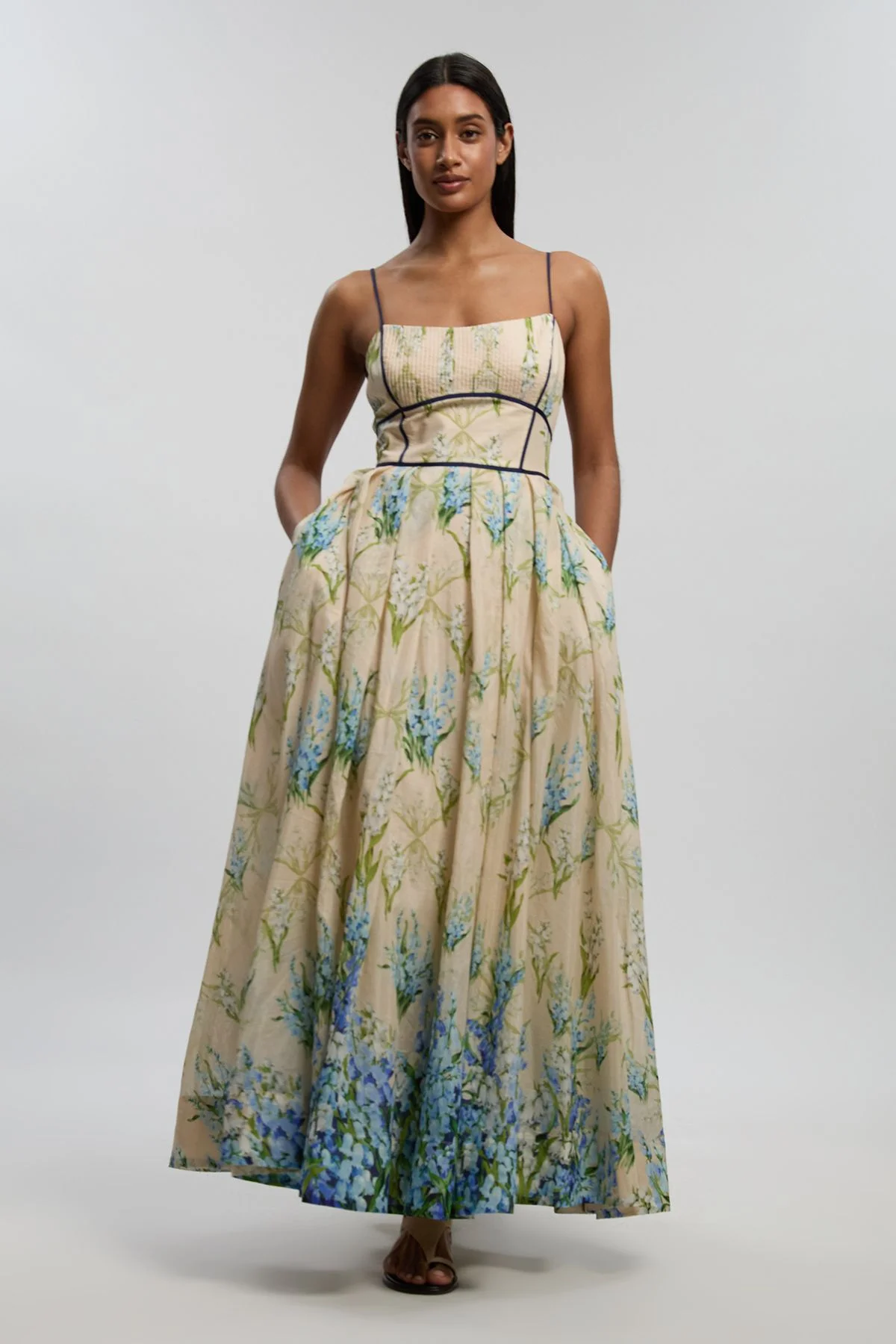- Luxurious silk cotton blend maxi dress with delicate floral pattern - Elegant strappy design with square neckline and contrast piping detail - Structured bodice with subtle pleating for a flattering silhouette - Full flowing skirt with practical side pockets - Ankle-grazing length (approx. 150cm) perfect for occasion wear This enchanting floral maxi dress from Karen Millen combines sophisticated design with effortless grace. The structured bodice creates a defined waistline while the flowing woven skirt moves beautifully with every step. Style with minimal strappy sandals as shown for garden parties and summer weddings, or transform for evening events with metallic accessories and an elegant updo. The cotton-silk blend offers a sumptuous texture and natural breathability, making it ideal for all-day wear at formal occasions. This versatile piece transitions seamlessly from daytime celebrations to evening receptions, embodying the refined craftsmanship and contemporary elegance that defines the Karen Millen aesthetic. A timeless addition to your occasion wardrobe that will serve you through wedding seasons and special events for years to come. Product Details & Care Main: 73% cotton, 27% silk, wash inside out, Model wears UK 8/US 4. Model Height 5"9. Length approx: 150cm