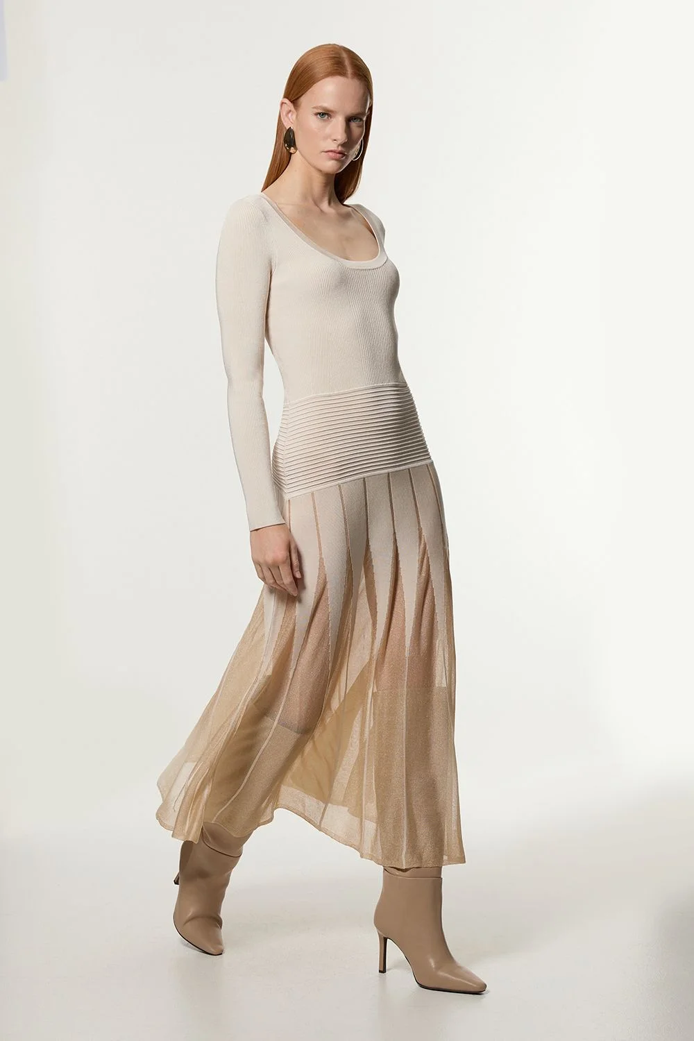 Slinky Knit Scooped Neck Sheer Detail Maxi Dress