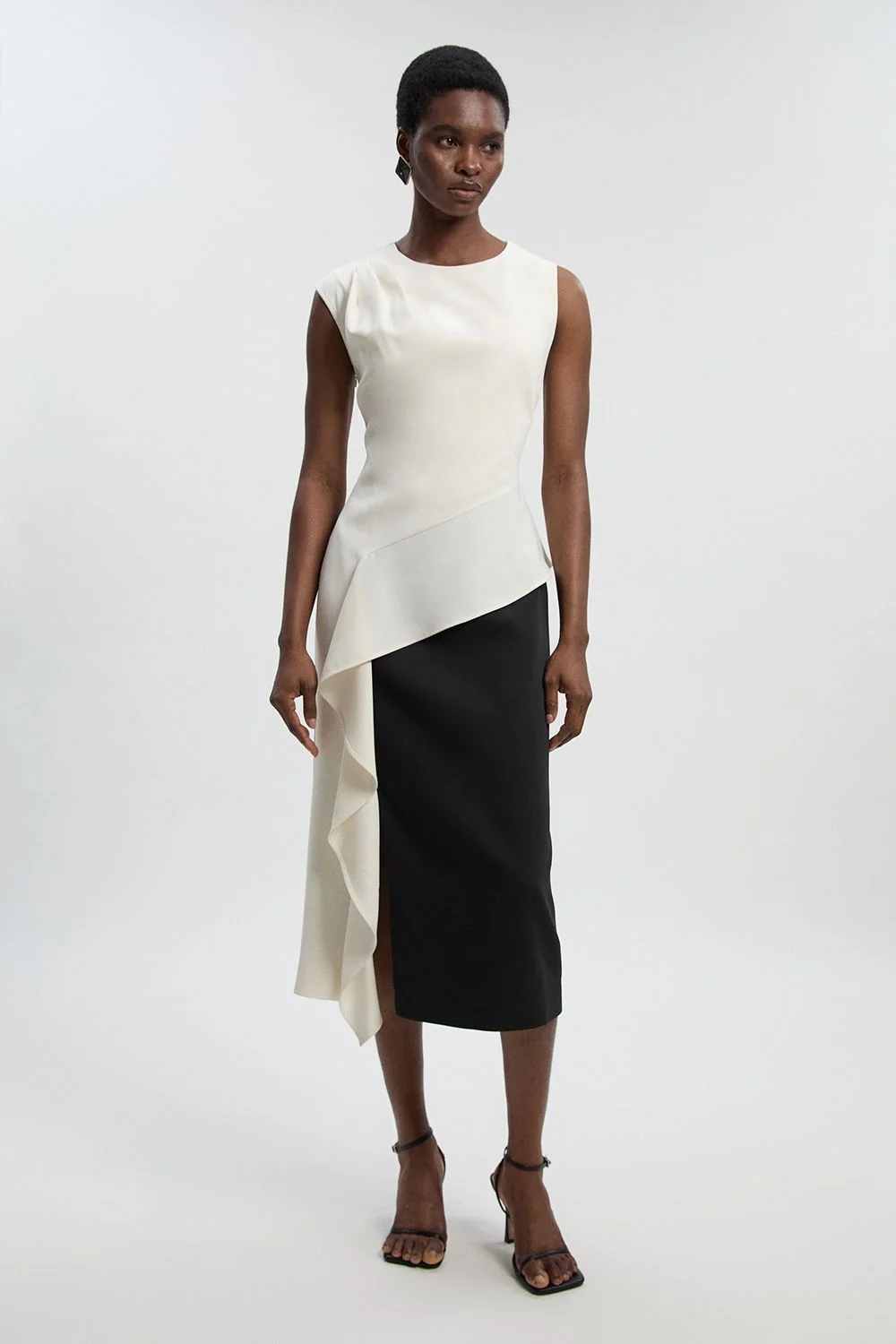 - Striking asymmetric neckline creates a sophisticated silhouette - Elegant draped waist detail adds contemporary dimension - Contrast colour-block design for a bold statement - Midi length offers versatile styling options for various occasions - Soft tailoring ensures comfort whilst maintaining a structured form This Karen Millen midi dress showcases the brand's commitment to expert craftsmanship with its thoughtfully designed asymmetric neckline and artful draped waist detail. The contrast colour-block design creates visual interest whilst the tailored silhouette flatters your figure with its structured yet fluid form. Perfect for daytime engagements, style with strappy heels as shown for lunch with friends, or dress down with a cropped denim jacket and flat sandals for family gatherings. The versatile midi length works beautifully for gallery visits or afternoon tea, whilst the contemporary design ensures you'll stand out for all the right reasons. Accessorise with minimal jewellery to let the dress's architectural elements take centre stage - a simple bracelet and statement earrings complete the look with understated elegance. Product Details & Care Main 1: 100% Polyester, Main 2: 100% Polyester, Lining: 100% Polyester Do not wash, do not bleach, do not tumble dry, cool iron on reverse, dry clean only in mild solvent, keep away from fire Model wears: UK10/US6. Models height approx: 5"9. Length approx: 125cm.