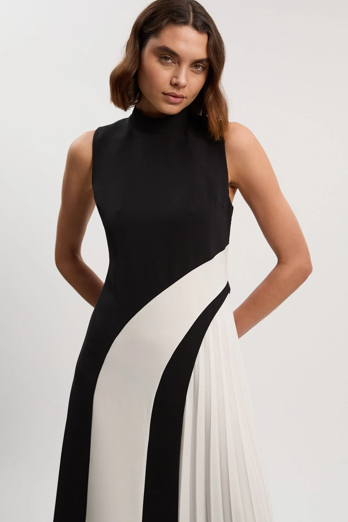 - Striking colour block design with elegant curved panels creating a sophisticated silhouette - High neck styling offers refined coverage perfect for formal occasions - Pleated midi-length skirt adds graceful movement and dimension - Sleeveless cut showcases arms whilst maintaining a polished aesthetic - Fully lined for comfort and a smooth, structured drape This tailored midi dress exemplifies Karen Millen's commitment to expert craftsmanship with its architectural colour blocking and precise pleating. The high neckline creates a refined canvas that transitions beautifully into the curved panel design, whilst the pleated skirt introduces graceful movement to the structured bodice. Style with strappy heels and a clutch for weddings and formal events, or dress down with pointed flats and a cropped jacket for gallery openings. The midi length offers versatility for various social occasions throughout the year, making this a cornerstone piece for your occasion wardrobe. The clean lines and contemporary silhouette ensure you'll command attention at any sophisticated gathering, from graduation ceremonies to summer races. Product Details & Care Main: 100% Polyester. Lining: 100% Polyester. Machine wash. Model wears: UK10/US6. Models height approx: 5"9. Length approx: 121cm.