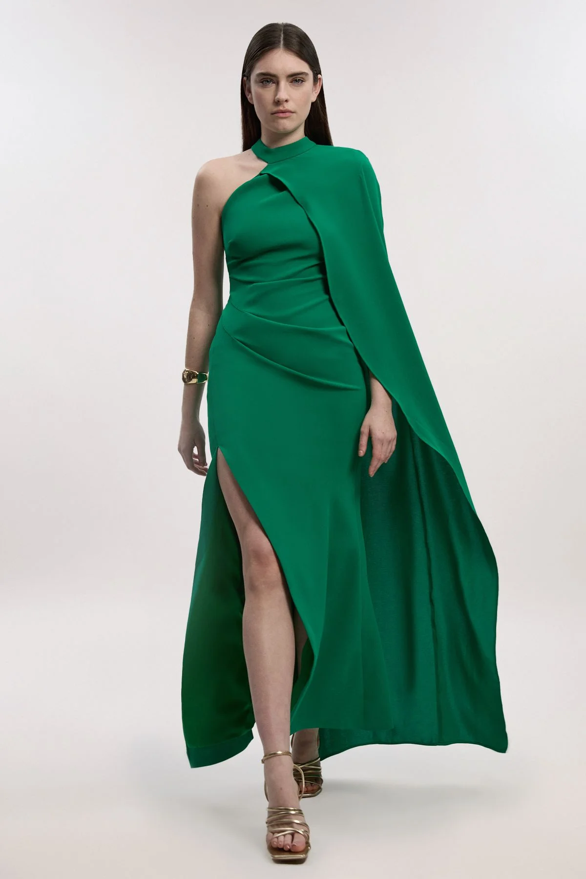 - Dramatic one-shoulder design with elegant cape sleeve detail for a sophisticated silhouette - High neckline creates a refined look whilst the flowing cape adds movement and drama - Soft tailoring with subtle gathering at the waist enhances the feminine form - Daring side split allows for graceful movement and adds a contemporary edge - Floor-sweeping maxi length (approx. 135cm) perfect for formal occasions Make an unforgettable entrance in this architectural masterpiece from Karen Millen. The one-shoulder cape sleeve maxi dress combines modern design with timeless elegance, creating a look that commands attention. The high neckline and soft tailoring work in harmony to create a refined silhouette, whilst the dramatic cape detail adds movement and intrigue. Style with metallic platform sandals as shown for maximum impact, and accessorise with statement gold jewellery to complement the dress's bold lines. The side split detail offers both practicality and allure, allowing you to move with confidence throughout any formal event. Perfect for weddings, black-tie affairs, or race day, this dress demonstrates expert craftsmanship and attention to detail. For cooler evenings, pair with a minimal clutch and delicate wrap to maintain the clean, architectural aesthetic that makes this piece so distinctive. Product Details & Care Main & Lining: 100% polyester. Machine wash. Model wears UK8/US4. Model height 5"9. Length approx: 135cm