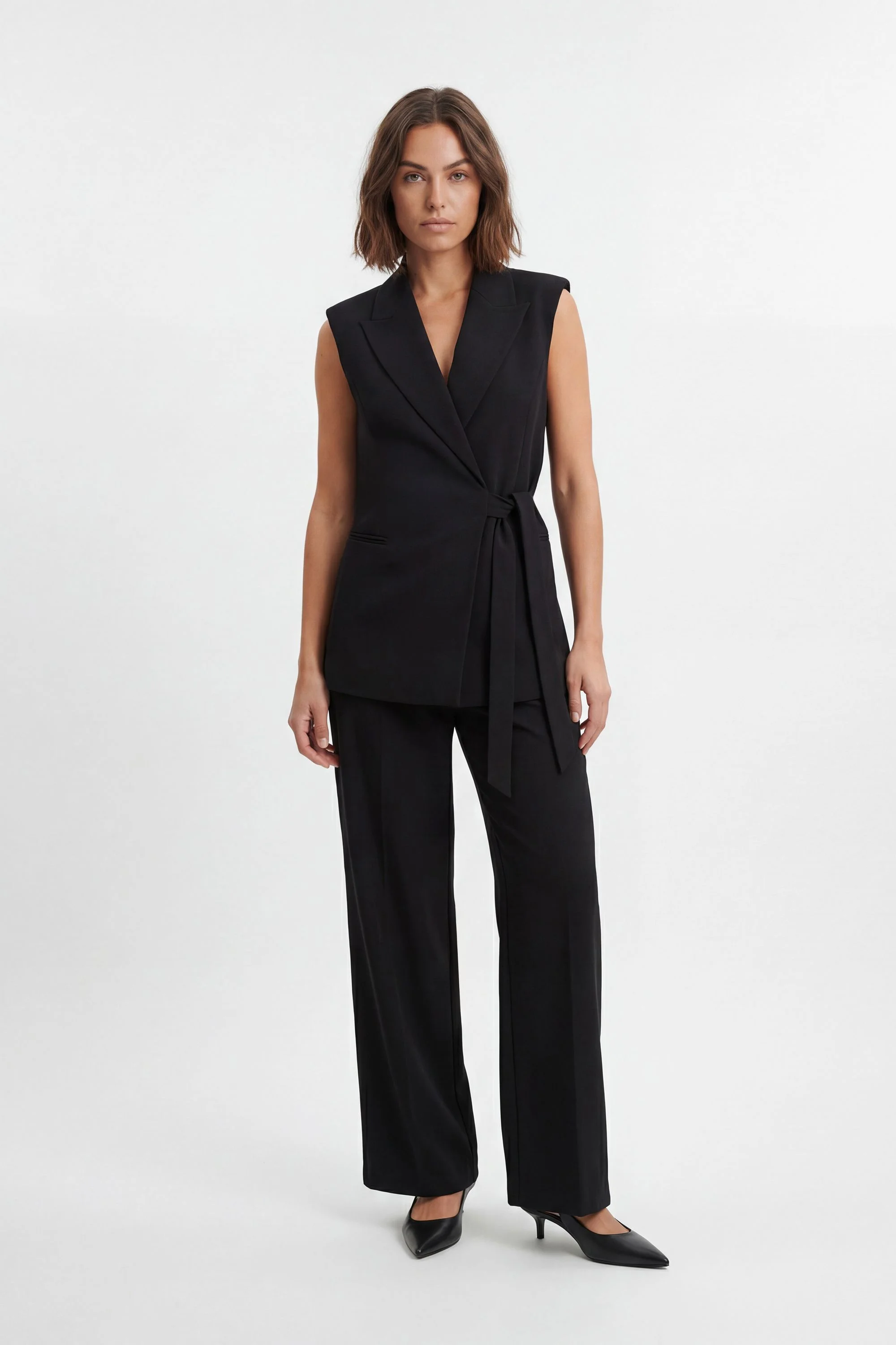 - Sleeveless design with structured shoulders for a contemporary silhouette - Elegant wrap detail with side tie closure adding feminine flair - Tailored slim fit that contours to your shape - Classic lapel collar offering sophisticated refinement - Functional side pocket for practicality without compromising style This soft tailored sleeveless blazer redefines corporate dressing with its modern wrap detail and elegant tie fastening. The sleeveless design makes it perfect for layering throughout the seasons whilst maintaining a polished aesthetic. Pair with the matching tailored trousers for a coordinated office ensemble, or style with a pencil skirt and silk blouse for important presentations. The versatile piece transitions effortlessly from day to evening - simply swap your court shoes for strappy heels and add statement jewellery. For weekend sophistication, wear unbuttoned over a crisp white shirt with tailored denim and pointed flats. The structured shoulders and defined waistline create a flattering silhouette that embodies the contemporary craftsmanship Karen Millen is renowned for, making this blazer an indispensable addition to your capsule wardrobe. Product Details & Care 66% Polyester, 28% Viscose/Rayon, 6% Elastane/Spandex, Wash with similar colours, Wash inside out, Iron on reverse. Model wears UK 10/US 6. Model Height 5"9. Length approx: 74cm