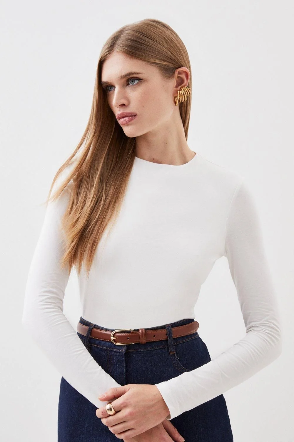 This essential Karen Millen long sleeve top combines simplicity with sophistication, making it a true wardrobe cornerstone. The stretch cotton jersey fabric moulds beautifully to your shape whilst allowing unrestricted movement throughout the day. Style it tucked into high-waisted denim trousers with statement sunglasses for an effortlessly chic daytime look, as seen on our model. For casual gatherings, pair with tailored wide-leg trousers and trainers, adding a structured blazer when the occasion calls for a touch more refinement. The clean lines and minimalist design ensure this piece transitions seamlessly from coffee dates to family gatherings. Its versatility shines when layered under pinafore dresses or worn beneath cardigans during cooler months, making this top an indispensable foundation for countless outfits throughout the seasons. Crafted from soft cotton jersey with added stretch for exceptional comfort and movement Classic crew neckline offers a timeless, versatile silhouette Long sleeves provide warmth and coverage for year-round styling Sleek, body-skimming regular fit creates a refined silhouette Smooth, seamless design makes this top perfect for layering or wearing alone Product Details & Care Main & Lining: 95% Cotton, 5% Elastane/Spandex. Machine wash on a 30 degree synthetic cycle. Do not dry clean. Model wears a UK size Small. Models height approx: 5''9.