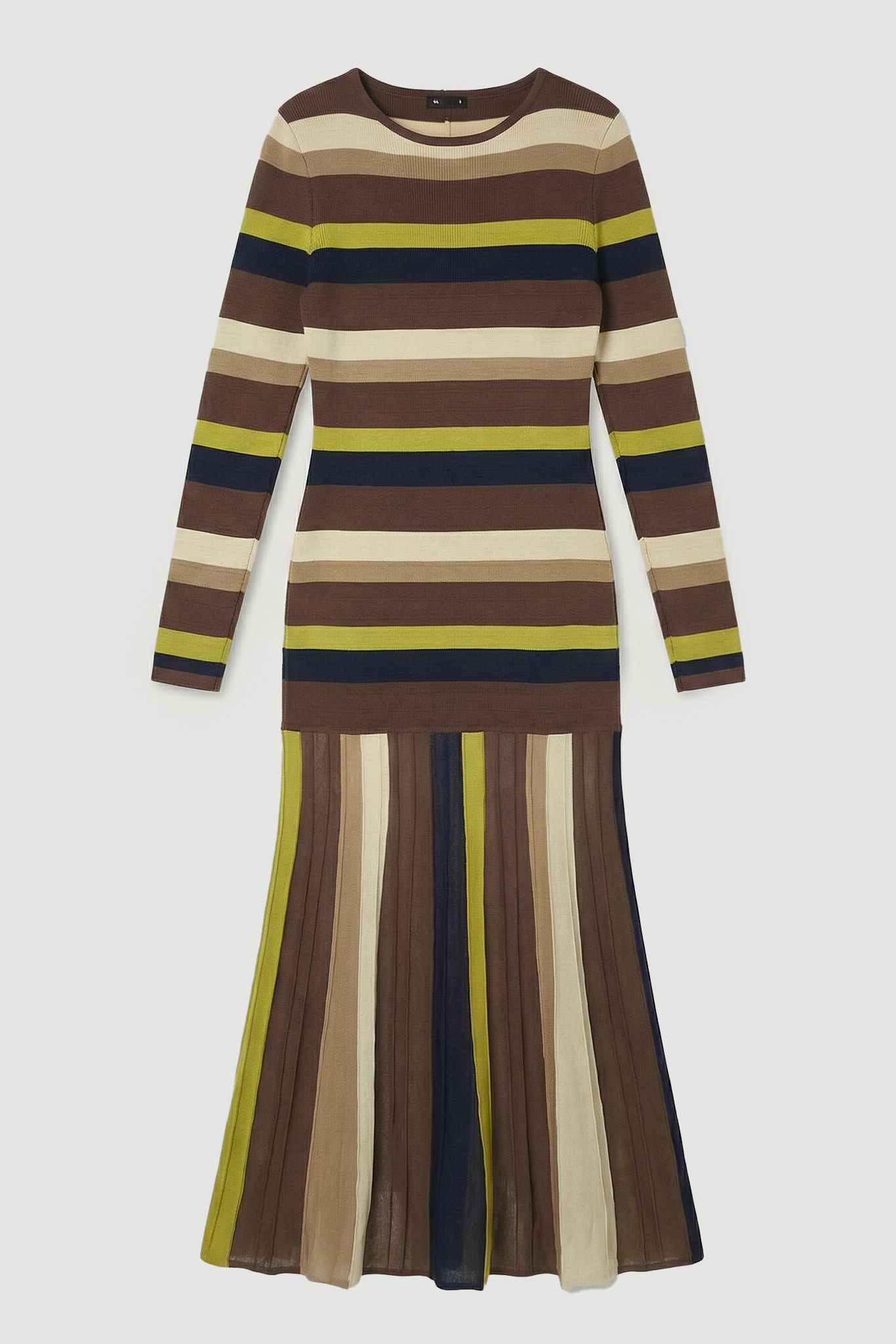 - Striking stripe pattern with contrasting horizontal bands on the bodice and vertical stripes on the skirt - Flattering crew neckline and long sleeves for versatile seasonal wear - Sophisticated maxi length with a fluid, pleated skirt that creates elegant movement - Crafted from a soft viscose blend knit that offers both comfort and structure - Distinctive two-part design with a fitted upper body transitioning into a flowing skirt This Karen Millen knitted maxi dress combines contemporary design with timeless sophistication. The contrasting stripe directions create a visually striking silhouette, with the horizontal bodice pattern drawing attention to the upper body whilst the vertical stripes on the skirt elongate the figure. Style as seen with heeled boots and a structured handbag for daytime polish, or pair with flat leather sandals and a woven tote for casual weekend brunches. The versatile design transitions effortlessly from family gatherings to coffee dates, whilst the knitted fabric ensures comfort throughout the day. For cooler weather, layer with a tailored denim jacket or lightweight trench coat. This piece exemplifies Karen Millen's commitment to craftsmanship with its thoughtful construction and attention to detail, making it a standout addition to your daywear collection. Product Details & Care Upper body: 68% Viscose filament, 32% Polyamide. Lower body: 89% Viscose filament, 11% Polyamide. Machine wash on a 30 degree cotton cycle. Due to the delicate nature of this fabric, care must be taken with jewellery and rough surfaces. Jewellery may snag this fabric. Model wears UK size Small. Models height approx: 5"9. Length approx: 124cm.
