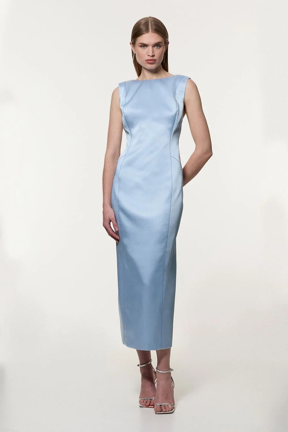 This Karen Millen dress embodies refined elegance, perfect for those special occasions that demand a touch of glamour. The structured viscose satin fabric creates a smooth, polished appearance while the tailored pencil silhouette sculpts your figure beautifully. The high neckline and maxi length combine to create a look of timeless sophistication, ideal for formal events, weddings, or high-profile gatherings. Style this showstopper with strappy metallic heels and statement earrings to complement its sleek lines. For cooler evenings, drape a finely knitted pashmina over your shoulders. This dress is versatile enough to transition from day to night - pair it with a tailored blazer for a chic daytime ensemble, then remove the layer to reveal its stunning back detail for evening affairs. Structured viscose satin fabric for a luxurious feel and appearance Tailored pencil silhouette for a sleek, figure-hugging fit Elegant high neckline adds sophistication Striking stitch detail enhances the structured design Maxi length offers a dramatic, floor-sweeping look Product Details & Care 88% polyester, 12% viscose. Lining: 100% polyester. Model wears UK10/US6. Model height 5"9. Length approx:126cm