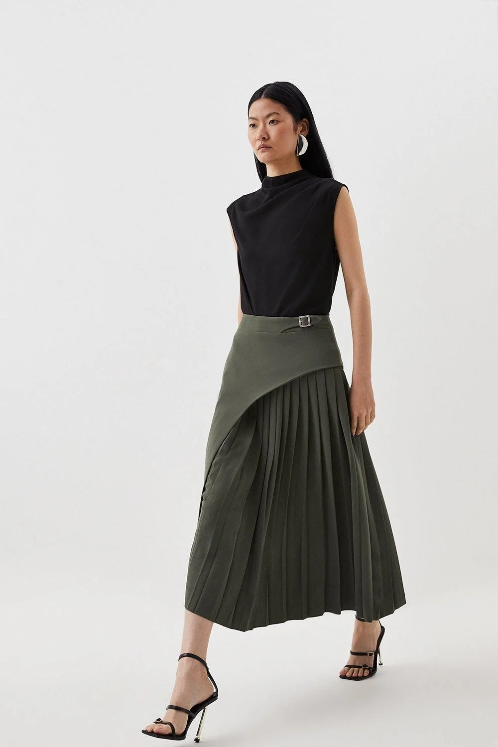 Feel elegant in our midi skirt, with a universally flattering silhouette, pleated detailing, and a high waistline, perfect for getting a little dressed up. Style this piece with strappy heels for an outfit that will turn heads from office days to upcoming occasions and events. Tailored Buckle Detail Pleated Midi Skirt Formal, Flowing Fit High Waistline Unique Pleated Panel Midi Length Metallic Buckle at WaistlineBrowse this seasons work skirts or discover the full range of workwear now. Product Details & Care Main: 100% Polyester. Lining: 100% Polyester. Dry Clean Only. Model wears UK size 8/ US size 4. Model height Approx: 5"9. Length Approx: 84cm.