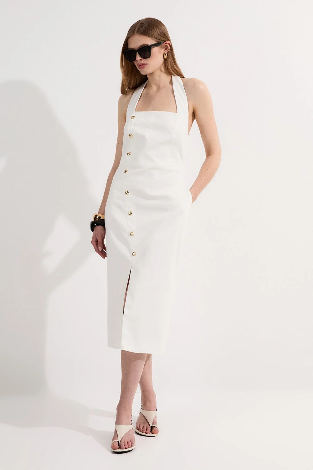 This Karen Millen denim halterneck dress combines timeless tailoring with modern design elements for versatile daywear styling. The structured silhouette sculpts your figure beautifully while the front button detailing and split create visual interest. Style with chunky gold bangles as shown for a coordinated look, or pair with white trainers and a denim jacket for casual weekend brunches. For family gatherings or informal dining, complement with block-heeled sandals and a woven clutch. The halterneck design showcases shoulders elegantly, making this piece perfect for warmer days or layered with a lightweight cardigan when the temperature drops. This dress transitions effortlessly from day to evening, simply switch your footwear from flats to low heels for after-work drinks or dinner dates. Striking halterneck design with elegant square neckline for a sophisticated silhouette Decorative gold-tone button detailing down the front adds contemporary charm Figure-flattering pencil cut with a midi length that hits mid-calf Front split detail provides ease of movement and a subtle touch of allure Contrast topstitching highlights the tailored denim construction Product Details & Care Main: 62% Cotton. 35% Polyester. 3% Elastane/Spandex. Lining: 100% Polyester. Dry clean only. Model wears UK Size 8/ US Size 4. Model height approx: 5"9. Length approx: 94cm