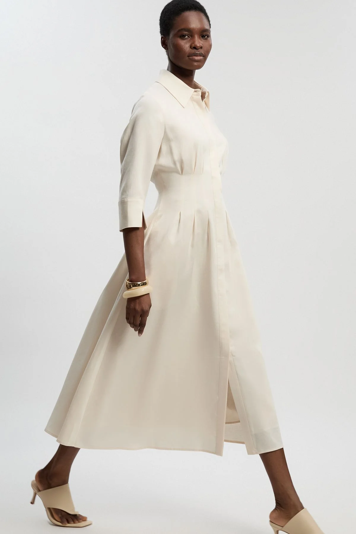 - Tailored midi dress with elegant darted waist detail for a flattering silhouette - Classic shirt collar and button-through front design offering timeless sophistication - Three-quarter length sleeves with split detail for refined movement - Practical side pockets seamlessly integrated into the pleated skirt - Linen blend fabric providing natural texture and breathability for all-day comfort This tailored midi dress exemplifies contemporary refinement with its structured silhouette and considered details. The darted waist creates a beautifully defined shape, while the pleated skirt flows gracefully to a midi length. Perfect for elevated daywear, style with minimal jewellery and pointed court shoes for important meetings or professional events. For summer garden parties, pair with strappy heeled sandals and a structured clutch. The versatile design transitions effortlessly from day to evening - simply add statement earrings and a sleek updo for dinner engagements. The button-through front offers styling versatility, whilst the crisp collar adds a touch of smart tailoring to this sophisticated piece. A true wardrobe investment that embodies the polished aesthetic Karen Millen is renowned for. Product Details & Care Main: 87% Lyocell, 13% Linen Lining: 100% cotton. Dry clean only. Model wears UK10/US6. Model height 5"9. Length approx. 131cm