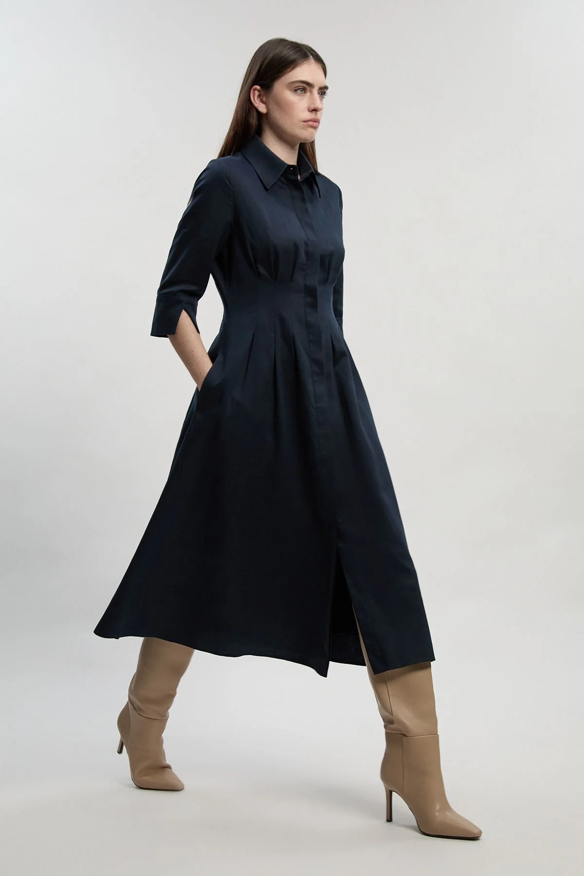 - Tailored midi dress with elegant darted waist detail for a flattering silhouette - Classic shirt collar and button-through front design offering timeless sophistication - Three-quarter length sleeves with split detail for refined movement - Practical side pockets seamlessly integrated into the pleated skirt - Linen blend fabric providing natural texture and breathability for all-day comfort This tailored midi dress exemplifies contemporary refinement with its structured silhouette and considered details. The darted waist creates a beautifully defined shape, while the pleated skirt flows gracefully to a midi length. Perfect for elevated daywear, style with minimal jewellery and pointed court shoes for important meetings or professional events. For summer garden parties, pair with strappy heeled sandals and a structured clutch. The versatile design transitions effortlessly from day to evening - simply add statement earrings and a sleek updo for dinner engagements. The button-through front offers styling versatility, whilst the crisp collar adds a touch of smart tailoring to this sophisticated piece. A true wardrobe investment that embodies the polished aesthetic Karen Millen is renowned for. Product Details & Care Main: 87% Lyocell, 13% Linen Lining: 100% cotton. Dry clean only. Model wears UK10/US6. Model height 5"9. Length approx. 131cm