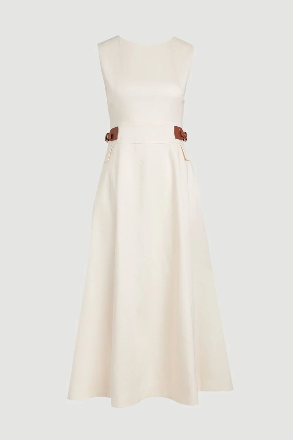 - Elegant round neck midi dress crafted from a linen blend for breathable comfort - Distinctive tab waist detail with contrasting hardware adds contemporary interest - Full skirt silhouette creates a graceful A-line shape with excellent movement - Practical side pockets discreetly integrated into the design - Sleeveless cut offers versatility for layering or wearing alone This tailored midi dress exemplifies refined simplicity with its clean lines and considered details. The structured bodice transitions beautifully into a full skirt that creates a flattering silhouette whilst the distinctive tab waist detail adds a contemporary twist to this timeless piece. Style with pointed kitten heels as shown for daytime sophistication, or transform for evening with statement earrings and a clutch bag. The linen blend fabric ensures this dress maintains its crisp appearance whilst offering breathability for all-day comfort. Perfect for garden parties, summer weddings or elevated office attire, this versatile dress can be styled with a tailored blazer for more formal settings or worn alone for warm-weather elegance. The midi length offers a modern yet modest approach to occasionwear that transitions effortlessly from day to evening. Product Details & Care Main: 87% Lyocell, 13% Linen. Model wears UK8/US4. Model height 5"9. Length approx 128cm