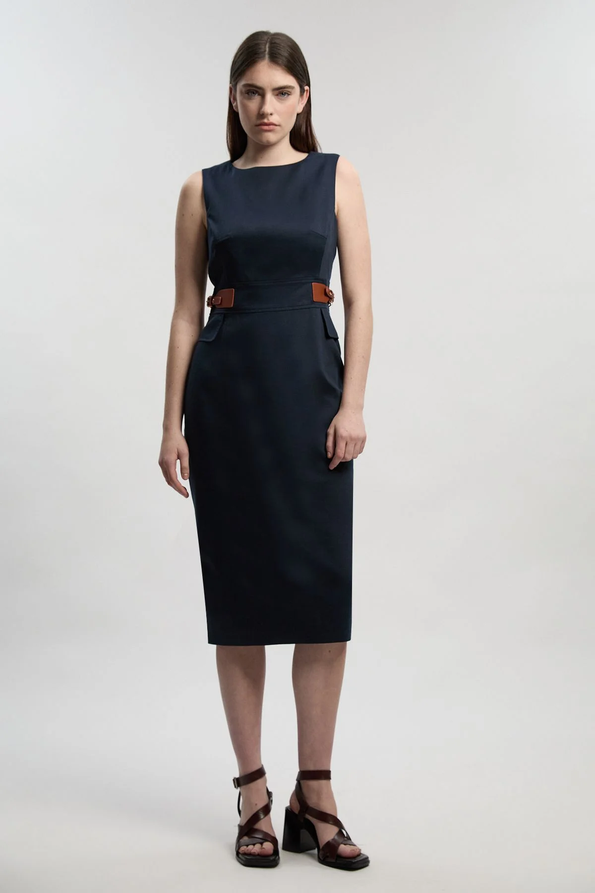 - Sleek tailored pencil midi dress with a sophisticated high neckline - Distinctive tab waist detail with elegant buckle fastening - Crafted from a linen blend fabric offering structure with natural texture - Practical side pocket detail for understated functionality - Streamlined silhouette with a flattering midi length hitting mid-calf This tailored pencil midi dress exemplifies refined simplicity with its clean lines and architectural structure. The distinctive tab waist detail creates a defined silhouette, while the high neckline adds a touch of contemporary sophistication. Perfect for elevated daywear, this dress transitions effortlessly from office to evening engagements. Style with pointed court shoes and a structured tote for corporate settings, or dress it up with statement earrings and a clutch for formal occasions. The linen blend construction offers a natural texture that maintains its shape throughout the day whilst providing comfort. This versatile piece works beautifully under a tailored blazer for business meetings or worn alone with a sleek updo to showcase its elegant neckline. A true wardrobe investment that embodies timeless British tailoring with modern sensibility. Product Details & Care Main: 87% lyocell 13% linen Lining: 100% cotton. Dry clean only. Model wears UK Size 10/US Size 6. Model's height approx. 5'9". Length approx. 130cm