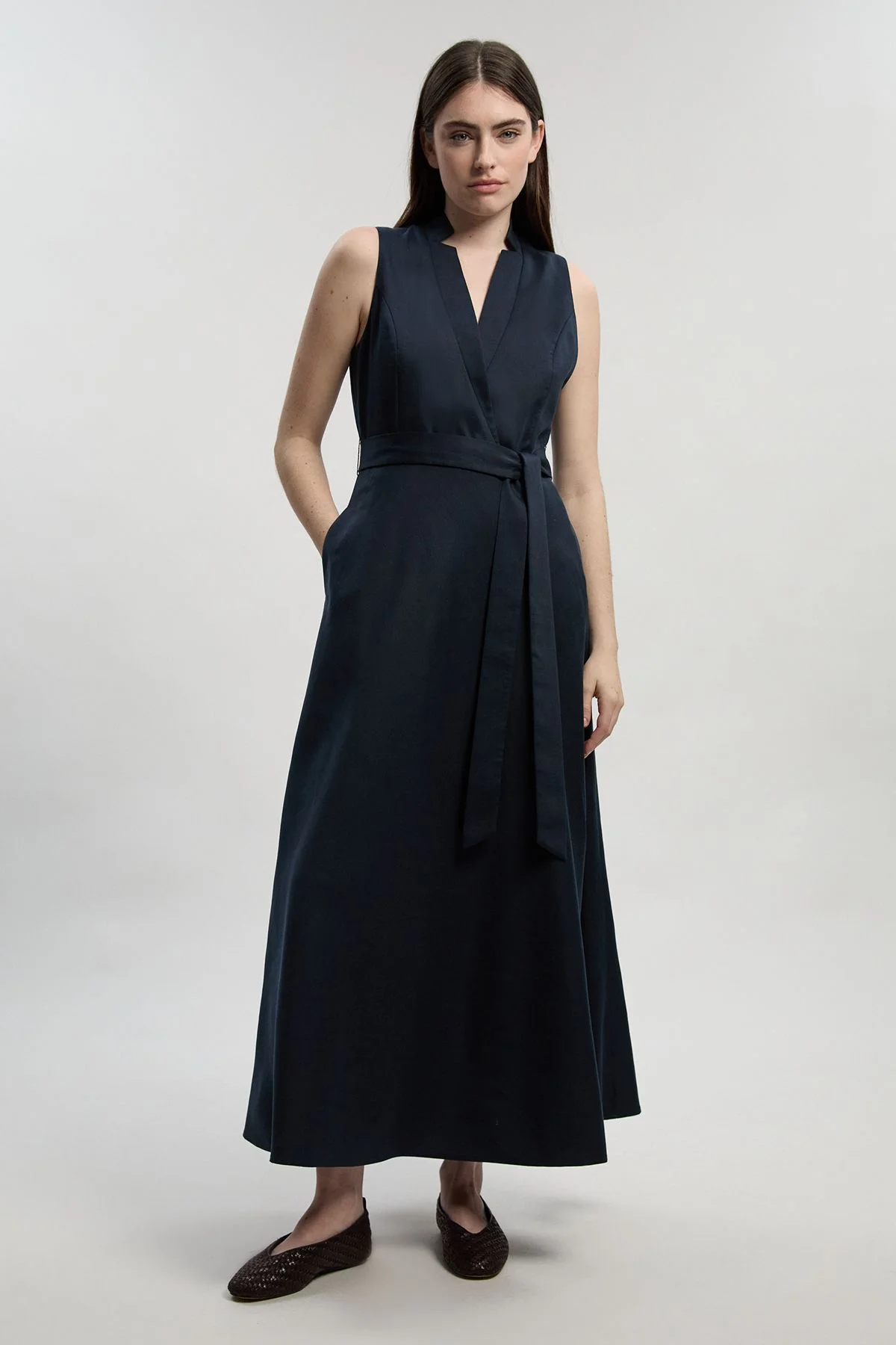 - Tailored linen-blend maxi dress with elegant wrap design for a refined silhouette - Sophisticated V-neckline creates a flattering frame for delicate jewellery - Self-tie waist belt accentuates the waistline while allowing for customised fit - Practical side pockets add functionality without compromising the clean lines - Sleeveless cut offers versatility for layering with tailored blazers or wearing alone This tailored wrap maxi dress embodies effortless sophistication with its clean lines and considered design. The wrap-style bodice creates a flattering V-neckline that transitions beautifully from day to evening, while the tie-waist detail allows you to define your silhouette with precision. Style with leather slide sandals and a coordinating clutch for elevated daytime events, or pair with structured heels and statement earrings for summer soirees. The maxi length offers a contemporary elegance that works wonderfully for garden parties, gallery openings or sophisticated brunches. For cooler evenings, layer with a cropped jacket or lightweight cardigan to maintain the dress's refined silhouette. The linen-blend fabric provides a natural drape that moves gracefully with you, ensuring comfort without sacrificing polish - a hallmark of the Karen Millen aesthetic. Product Details & Care Main: 87% Lyocell, 13% Linen. Lining: 100% cotton. Dry clean only. Model wears UK10/US6. Model height 5"9. Length approx. 144cm