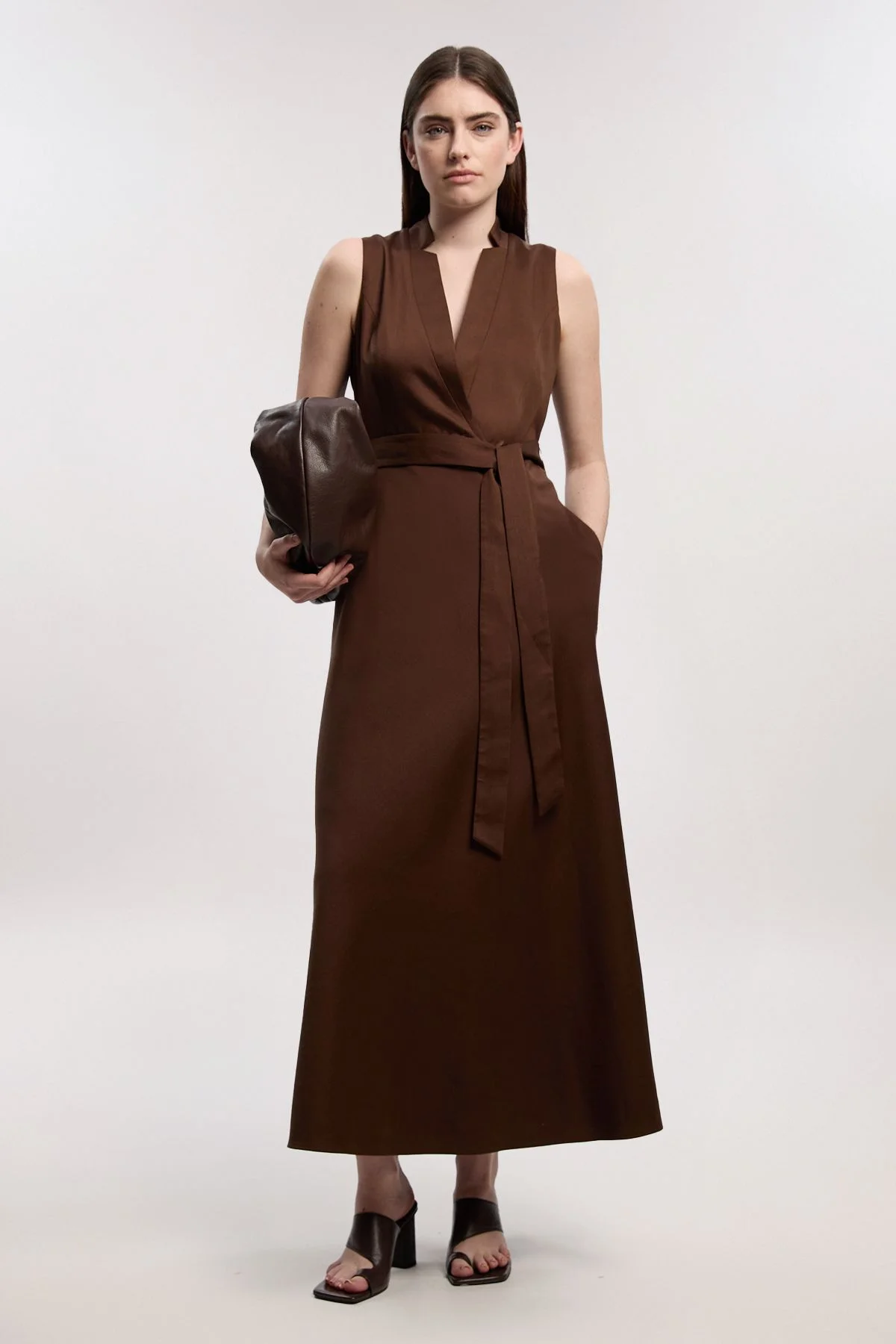 - Tailored linen-blend maxi dress with elegant wrap design for a refined silhouette - Sophisticated V-neckline creates a flattering frame for delicate jewellery - Self-tie waist belt accentuates the waistline while allowing for customised fit - Practical side pockets add functionality without compromising the clean lines - Sleeveless cut offers versatility for layering with tailored blazers or wearing alone This tailored wrap maxi dress embodies effortless sophistication with its clean lines and considered design. The wrap-style bodice creates a flattering V-neckline that transitions beautifully from day to evening, while the tie-waist detail allows you to define your silhouette with precision. Style with leather slide sandals and a coordinating clutch for elevated daytime events, or pair with structured heels and statement earrings for summer soirees. The maxi length offers a contemporary elegance that works wonderfully for garden parties, gallery openings or sophisticated brunches. For cooler evenings, layer with a cropped jacket or lightweight cardigan to maintain the dress's refined silhouette. The linen-blend fabric provides a natural drape that moves gracefully with you, ensuring comfort without sacrificing polish - a hallmark of the Karen Millen aesthetic. Product Details & Care Main: 87% Lyocell, 13% Linen. Lining: 100% cotton. Dry clean only. Model wears UK10/US6. Model height 5"9. Length approx. 144cm
