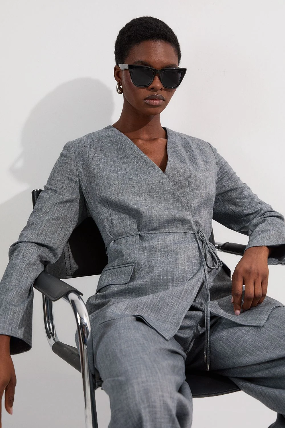 This Karen Millen Tailored Marl Tie Waist Blazer redefines smart-casual dressing with its contemporary collarless design and sophisticated wrap silhouette. The adjustable tie waist allows you to customise your fit while creating a feminine shape that works beautifully for daytime engagements. Style with the matching wide-leg trousers as seen on our model for an impeccably coordinated ensemble, perfect for family gatherings or lunch with friends. For a more relaxed approach, pair with slim-fit jeans and leather trainers, adding statement earrings for a touch of personality. The structured shoulders and clean lines make this blazer an excellent layering piece for transitional weather, simply add a fine-knit top underneath for cooler days. Complete your look with a structured clutch bag for an effortlessly polished daywear outfit that conveys confidence and style. Collarless wrap design with elegant tie waist detail for a flattering silhouette Tailored marl fabric with subtle texture adds sophisticated dimension Functional side pockets provide practicality without compromising style Regular fit with structured shoulders creates a refined daywear profile Versatile blazer that pairs effortlessly with matching trousers for a coordinated look Matching piece available, sold separately. Product Details & Care Main: 55% Polyester. 43% Viscose/Rayon. 2% Elastane/Spandex. Lining: 100% Polyester. Dry clean only. Model wears UK Size 8/ US Size 4. Model height approx: 5"9. Length approx: 78cm