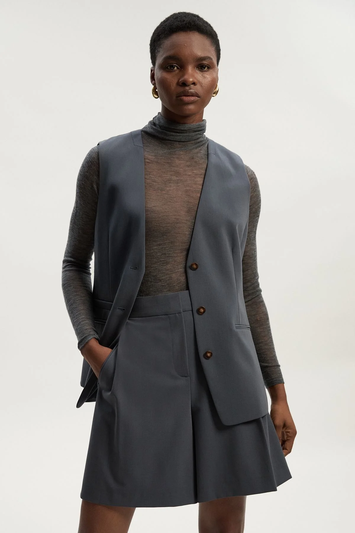 These Karen Millen Tailored Twill Essential City Shorts are the cornerstone of a sophisticated daywear wardrobe. The high-waisted design creates a flattering silhouette, whilst the structured twill fabric maintains shape throughout the day. These shorts offer the perfect balance of comfort and style for those busy days when you need to look put-together without compromising on ease of movement. Tailored city shorts with a high-waisted design Practical side pockets Sleek button fastening Mid-thigh length Product Details & Care Main: 71% Polyester. 18% Viscose/Rayon. 7% Elastane/Spandex. 2% Other Fibres. 2% Wool. Lining: 100% Polyester. Dry separately. Model wears UK 8/US 4. Model Height 5"9. Length approx: 49cm