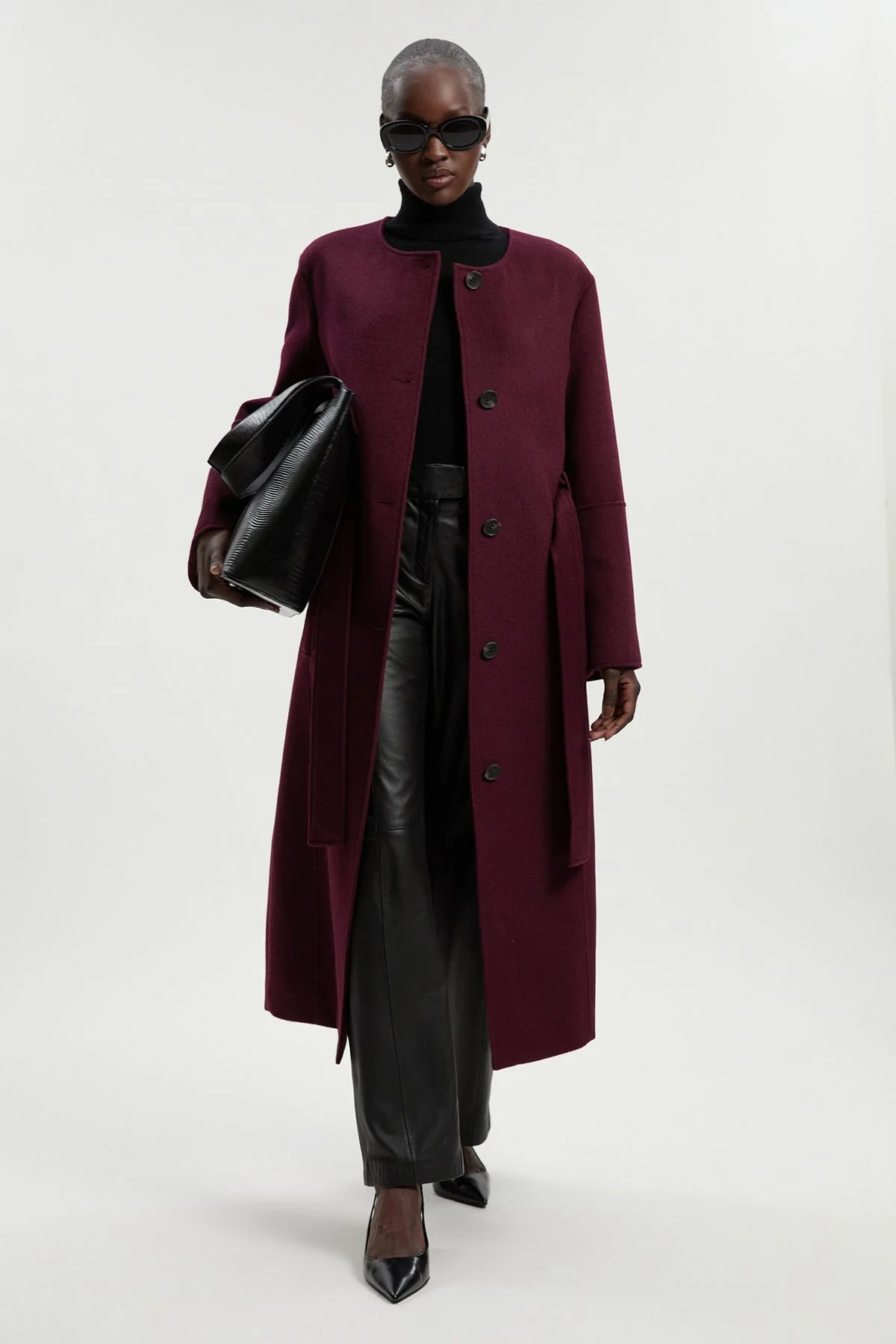 Make a statement in this striking Karen Millen maxi coat, designed specifically for taller frames. The brushed wool blend offers warmth without bulk, while the collarless neckline creates a modern, minimalist aesthetic. This coat transitions from autumn through winter, making it a versatile addition to your wardrobe. The clean lines and understated elegance reflect Karen Millen's commitment to timeless design, ensuring this piece remains relevant season after season. Brushed wool blend maxi coat Single-breasted button fastening Matching fabric belt Tailored regular fit for taller frames Product Details & Care Main: 48% Polyester, 48% Wool, 4% Other fibres. Lining: 55% Polyester, 45% Viscose/Rayon. Model wears UK10. Approx length: 125cm