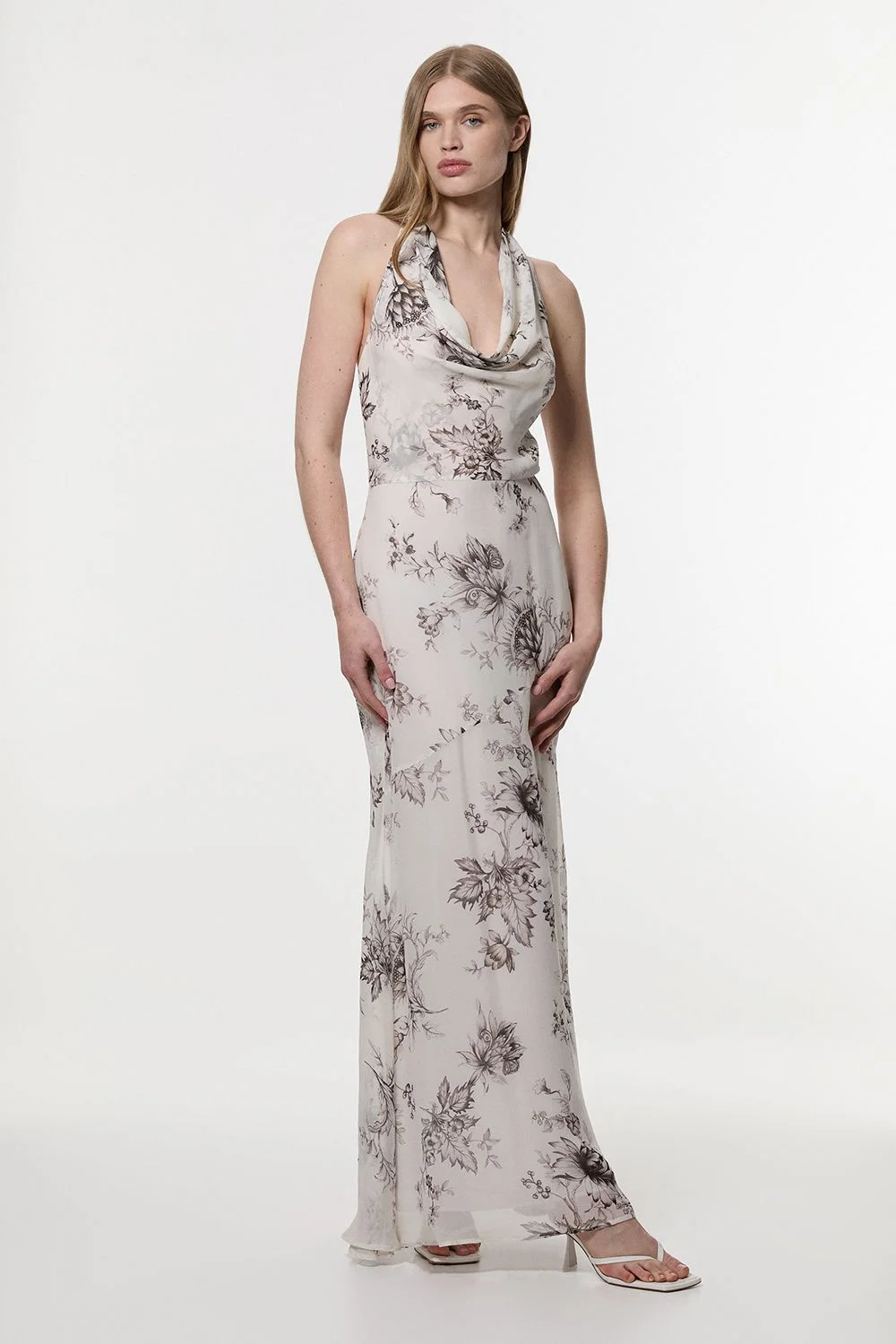 This captivating halterneck dress from Karen Millen showcases a timeless elegance with its flowing silhouette and artistic floral pattern. The deep V neckline frames the decolletage beautifully, whilst the open back with tie detail adds a touch of drama. Perfect for summer weddings and formal garden parties, this dress exquisitely balances sophistication with feminine charm. Style with strappy heeled sandals for classic occasion wear, or dress down with flat metallic sandals for elegant daytime events. For cooler evenings, layer with a lightweight pashmina or tailored blazer. The versatile design transitions effortlessly from afternoon champagne receptions to evening celebrations, making it a standout piece for your occasion wardrobe. Elegant halterneck design with a deep V neckline Sheer viscose georgette fabric with a delicate sketchy floral pattern throughout Striking open back with delicate tie detail Floor-length maxi style Product Details & Care Main: 100% Viscose. Lining: 100% Polyester. Dry Clean Only. Model wears UK Size 8/ US Size 4. Model height approx: 5"9. Length approx: 135cm