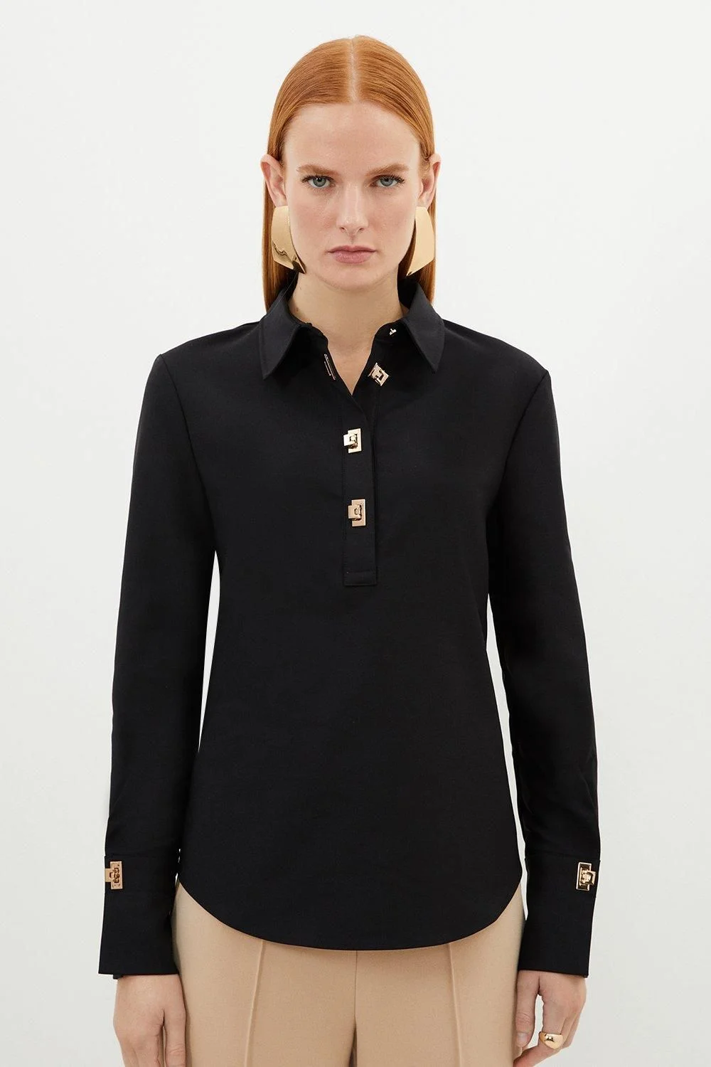 - Distinctive gold clasp detailing adds a touch of sophistication to this collared shirt - Crafted from techno cotton woven fabric for comfort with structure - Boxy fit creates a contemporary silhouette that's both flattering and on-trend - Long sleeves with elegant gold hardware accents at the cuffs - Versatile half-placket design offers a modern twist on the classic shirt This Karen Millen woven shirt combines timeless design with contemporary details for effortless daywear elegance. The structured collar and boxy silhouette create a refined yet relaxed look, while the striking gold clasp detailing adds a distinctive touch that elevates the piece beyond the ordinary. Style with tailored trousers as shown for a polished daytime ensemble, or pair with your favourite denim for a smart-casual weekend look. The versatile design makes it perfect for family gatherings or casual brunches with friends. The cotton-blend fabric offers just the right amount of stretch for comfort throughout the day without compromising on structure. This shirt exemplifies Karen Millen's commitment to expert craftsmanship and contemporary design, making it a wardrobe staple that transitions seamlessly from season to season. Product Details & Care 50% Cotton, 47% Polyamide, 3% Elastane, wash with similar colours, wash inside out, iron on reverse, Model wears UK 8/US 4. Model Height 5"9. Length approx: 70cm