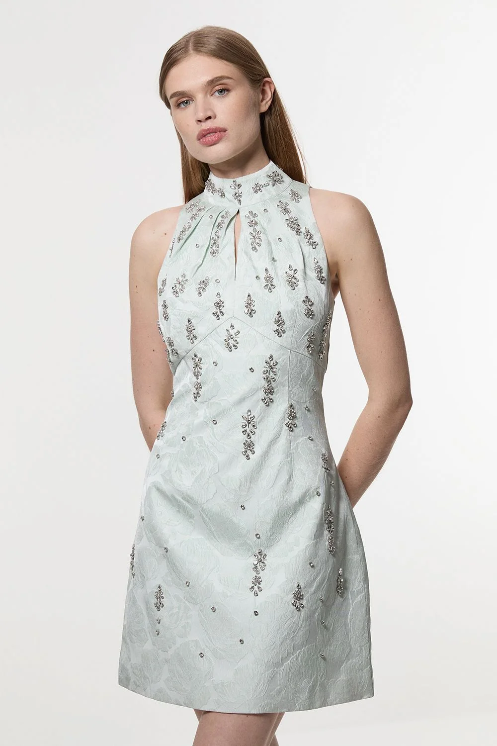 This Karen Millen mini dress combines timeless elegance with modern flair. The textured jacquard fabric creates a luxurious foundation for the stunning crystal embellishments that catch the light with every movement. The high neckline with its subtle keyhole detail offers a refined yet striking look, whilst the sleeveless design ensures you stay comfortable throughout your event. Crystal embellishments High neckline with keyhole detail Sleeveless design Mini length Product Details & Care Main: 100% Polyester. Lining: 90% Polyester. 10% Elastane/Spandex. Do not iron embellishment. Iron on reverse. Place in a delicates bag prior to cleaning. Trims must be covered during cleaning. Due to the delicate nature of this fabric, care must be taken with jewellery and rough surfaces. Jewellery may snag this fabric. Model wears UK Size 8/ US Size 4. Model height approx: 5"9. Length approx: 91cm