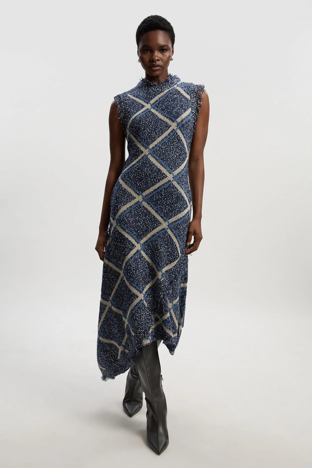 - Textured tweed yarn knit with distinctive metallic flecks throughout - Elegant crew neckline with sleeveless design for versatile layering - Sophisticated fringe trim detailing along the edges for dimensional appeal - Flattering midi length with subtle flare towards the hemline - Asymmetric hem creates visual interest and movement when walking This Karen Millen tweed yarn dress combines contemporary design with timeless sophistication. The textured knit construction offers both comfort and structure, whilst the fringe trim adds a touch of artisanal craftsmanship to your daywear collection. Style with knee-high leather boots for an effortlessly chic autumn look, or pair with flat ankle boots and an oversized cardigan for family gatherings. The versatile midi length works beautifully for casual lunches or gallery visits, and the sleeveless silhouette allows for creative layering with fine knits underneath during cooler months. For a polished daytime ensemble, add a structured blazer and crossbody bag-the perfect balance of refinement and practicality that reflects the Karen Millen woman's appreciation for expert craftsmanship and contemporary elegance. Product Details & Care Main: 39% Polyester, 36% Acrylic, 15% Cotton, 7% Nylon, 3% Metallised fibre/Metallic fibre. Machine wash at 30 degrees. Models wears UK size Small. Models height approx 5\'9.