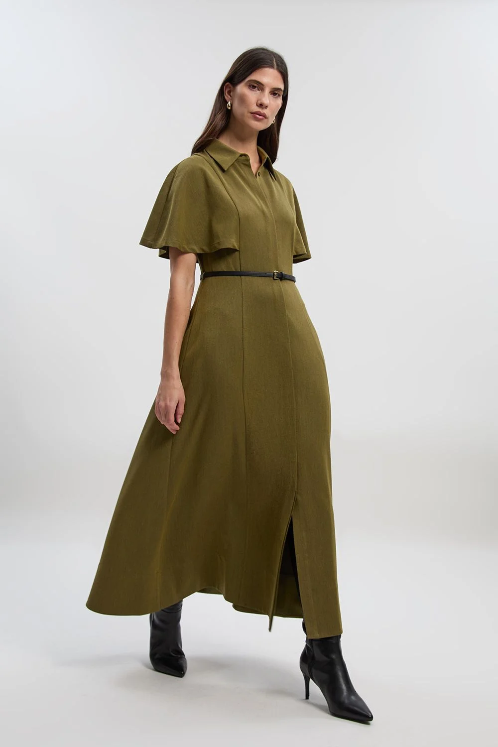 - Dramatic cape sleeves create a sophisticated silhouette with elegant movement - Classic collared neckline adds a refined touch to this midi dress - Included belt cinches the waist for a flattering, defined shape - Front split detail offers ease of movement and contemporary appeal - Midi length design provides versatile styling options for various occasions This Karen Millen shirt dress combines timeless tailoring with contemporary design elements for a piece that transitions effortlessly from day to evening. The distinctive cape sleeves create a dramatic yet refined silhouette, while the collared neckline and belted waist offer structure and definition. Style with ankle boots as shown for a modern daytime look perfect for lunch dates or gallery visits. For more casual gatherings, pair with white trainers and a crossbody bag for an effortless weekend ensemble. The front split adds a subtle contemporary touch whilst ensuring comfortable movement throughout the day. This versatile piece works beautifully layered under a lightweight trench for cooler days or worn alone with statement earrings for family celebrations. A true wardrobe staple that embodies the polished yet contemporary aesthetic that Karen Millen is renowned for. Product Details & Care Shell: 68% Polyester, 30% Viscose, 2% Elastane, Lining: 100% Polyester, Wash with similar colours, Wash inside out, Do not tumble dry, Do not bleach, Iron on reverse, Remove belt before cleaning, Model wears UK 8/US 4. Model Height 5"9. Length approx: 125cm