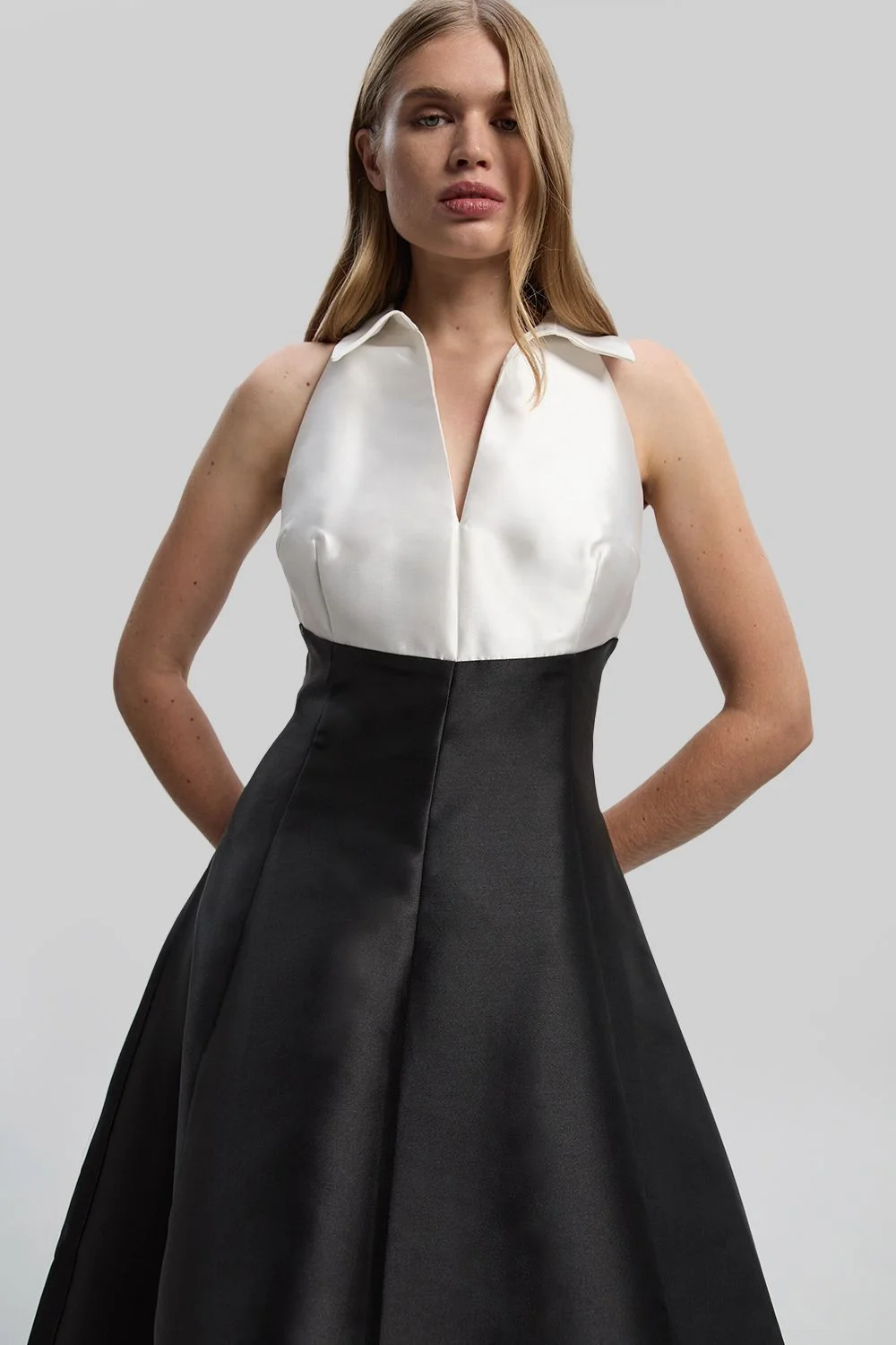 - Striking contrast tuxedo-inspired design with crisp collar detail - Sleeveless silhouette with elegant V-neckline for a sophisticated look - Dramatic full skirt construction creating a stunning silhouette - Tailored fit through bodice transitioning into a voluminous skirt - Midi-length design perfect for formal occasions (approx. 123cm) Make a statement at your next formal event with this Karen Millen Contrast Tux Tailored Shirt Dress. The sophisticated design combines classic tuxedo styling with contemporary flair, featuring a structured bodice with a crisp collar that frames the face beautifully. The tailored waistline creates a flattering shape before flowing into a full, sweeping skirt that moves gracefully with every step. Perfect for weddings, races or graduation ceremonies, this dress commands attention whilst maintaining an air of refinement. Style with pointed court shoes and a sleek clutch for traditional occasions, or modernise with statement jewellery and a bold lip for evening events. The versatile design allows for customisation to suit your personal style whilst ensuring you remain the epitome of polished glamour. Product Details & Care Main: 100% Polyester, Lining: 100% Polyester Wash at 30°C synthetic cycle, do not bleach, do not tumble dry, cool iron, do not dry clean, wash dark colours separately, iron on reverse Model wears: UK10/US6. Models height approx: 5"9. Length approx: 123cm.
