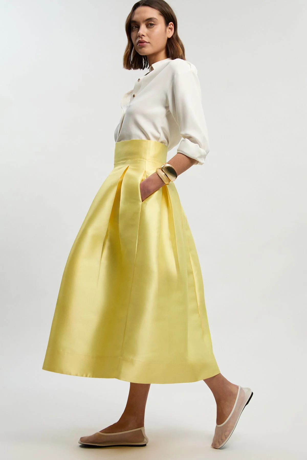 - Dramatic maxi skirt with structured pleating for a voluminous silhouette - High-waisted design with a flattering fit that accentuates the waistline - Fully lined for comfort and optimal drape - Ankle-grazing length perfect for showcasing statement footwear - Woven twill fabric offering substantial weight and elegant structure This statement twill woven prom maxi skirt embodies sophisticated drama with its architectural silhouette and structured pleating. The high-waisted design creates a flattering profile while the voluminous shape brings contemporary elegance to formal occasions. Style with a coordinating crop top as shown for a modern two-piece ensemble, or pair with a tailored blouse for more traditional events. The ankle-length hem allows for a glimpse of elegant heels, making it ideal for weddings, formal galas, or graduation ceremonies. For cooler evenings, drape a structured blazer over your shoulders for an effortlessly refined look. The skirt's substantial construction holds its shape beautifully throughout the evening, ensuring you maintain a poised and polished appearance from arrival to departure. Product Details & Care Main: 100% Polyester. Lining: 100% Polyester. Wash dark colours separately. Model wears UK Size 8/ US Size 4. Model height approx: 5"9. Length approx: 101cm