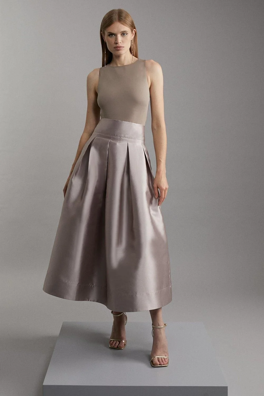 - Dramatic maxi skirt with structured pleating for a voluminous silhouette - High-waisted design with a flattering fit that accentuates the waistline - Fully lined for comfort and optimal drape - Ankle-grazing length perfect for showcasing statement footwear - Woven twill fabric offering substantial weight and elegant structure This statement twill woven prom maxi skirt embodies sophisticated drama with its architectural silhouette and structured pleating. The high-waisted design creates a flattering profile while the voluminous shape brings contemporary elegance to formal occasions. Style with a coordinating crop top as shown for a modern two-piece ensemble, or pair with a tailored blouse for more traditional events. The ankle-length hem allows for a glimpse of elegant heels, making it ideal for weddings, formal galas, or graduation ceremonies. For cooler evenings, drape a structured blazer over your shoulders for an effortlessly refined look. The skirt's substantial construction holds its shape beautifully throughout the evening, ensuring you maintain a poised and polished appearance from arrival to departure. Product Details & Care Main: 100% Polyester. Lining: 100% Polyester. Wash dark colours separately. Model wears UK Size 8/ US Size 4. Model height approx: 5"9. Length approx: 101cm