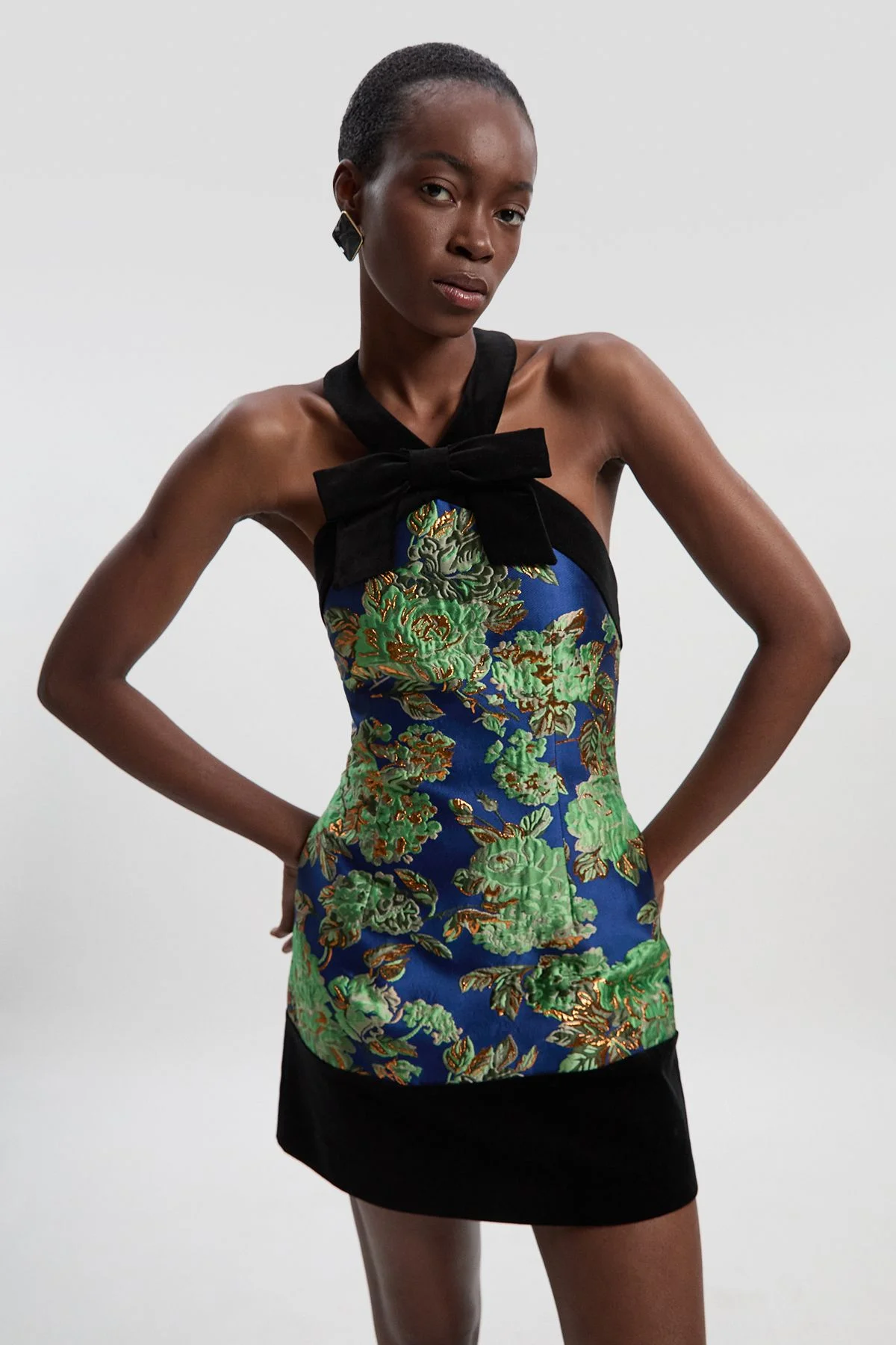 - Striking halterneck design with elegant velvet bow detail at the neckline - Luxurious jacquard pattern bodice contrasting with smooth velvet hem - Tailored mini silhouette offering a sophisticated yet contemporary shape - High neckline creating a refined and polished appearance - Sleek, structured fit perfect for showcasing your figure at formal occasions This exquisite Karen Millen mini dress masterfully combines opulent textures for a truly distinctive evening look. The striking halterneck design with its velvet bow detail creates an elegant focal point, whilst the rich jacquard pattern bodice transitions beautifully into the sumptuous velvet hem. The tailored silhouette ensures a flattering fit that honours your natural shape without compromising on comfort. Style with minimal jewellery to let the dress command attention - a pair of delicate drop earrings and a sleek clutch are all you need. Perfect for weddings, formal dinners, or race day events where sophistication meets contemporary glamour. The mini length offers versatility for styling - pair with classic court shoes for traditional elegance or statement heels to add a modern twist to this already captivating ensemble. Product Details & Care Main 1: 73% Polyester, 14% Metallised fibre, 13% Polyamide; Main 2: 98% Cotton, 2% Elastane/Spandex; Lining: 100% Polyester Do not wash, do not bleach, do not tumble dry, cool iron, dry clean with mild solvent reduced cycle, keep away from fire Model wears: UK10/US6. Models height approx: 5"9. Length approx: 58cm.