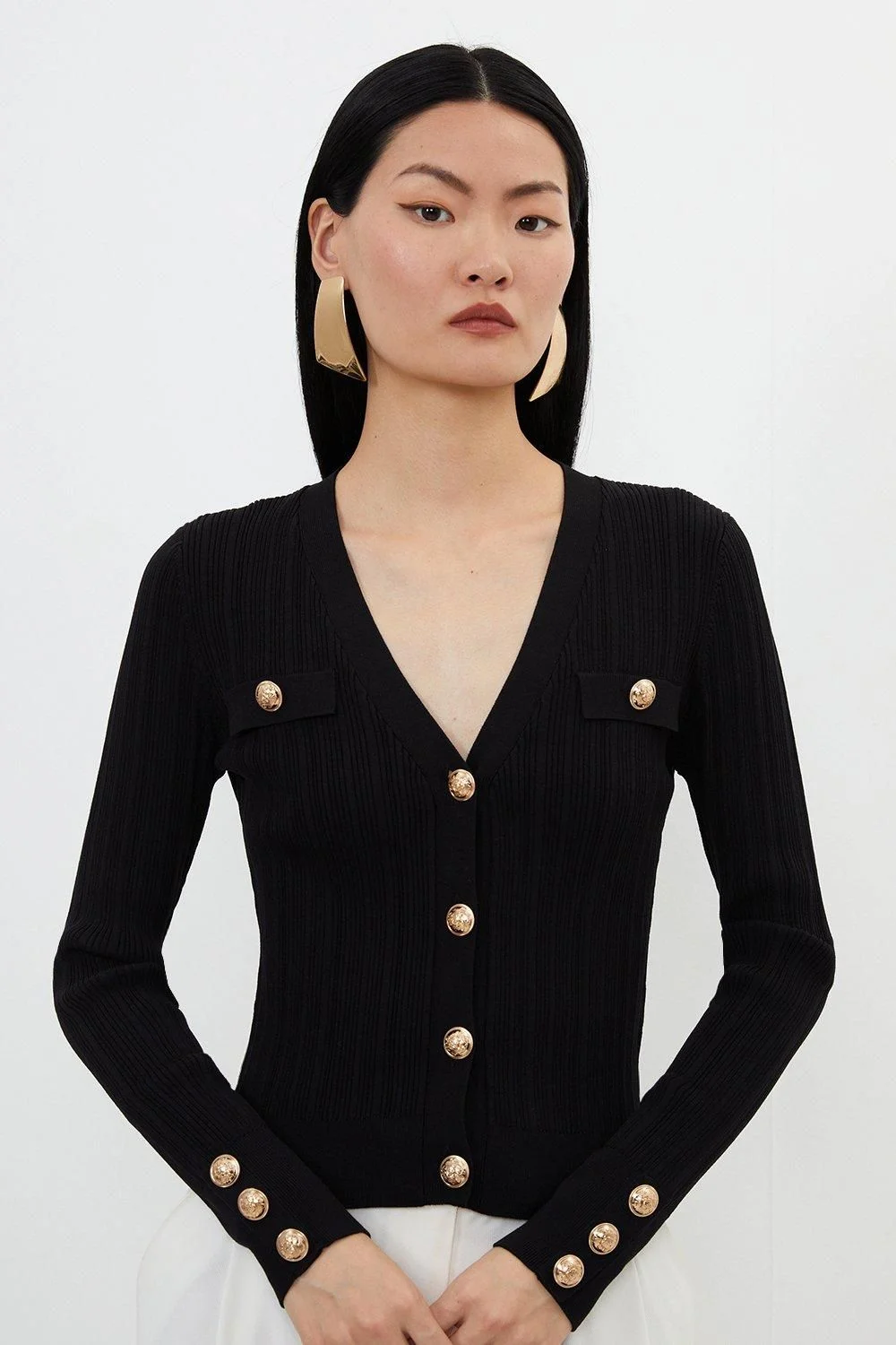 - Elegant V-neck cardigan with distinctive military-inspired gold-tone buttons - Ribbed texture creates a flattering silhouette that maintains its shape throughout wear - Decorative button detailing at cuffs adds a sophisticated touch - Versatile dry handle finish offers comfortable all-day wear - Structured military-style chest pockets enhance the contemporary design This Karen Millen ribbed cardigan combines timeless elegance with contemporary military-inspired detailing. The streamlined silhouette features distinctive gold-tone buttons that create a polished focal point, whilst the V-neckline frames your decolletage beautifully. Style with tailored white trousers as shown for a crisp daytime look, or pair with your favourite denim and ankle boots for weekend brunches. The versatile design transitions effortlessly from office to casual gatherings, making it an essential layering piece for your wardrobe. The ribbed texture ensures the cardigan maintains its shape throughout the day, whilst the dry handle finish provides comfort and ease of movement. Perfect for family gatherings or coffee dates, this cardigan offers sophisticated style without compromising on practicality. Product Details & Care Main: 53% Polyamide, 47% Viscose/Rayon. Machine wash with similar colours, on a 30 degree cotton cycle. Model wears UK size Small. Models height approx: 5"9. Length approx: 50cm.