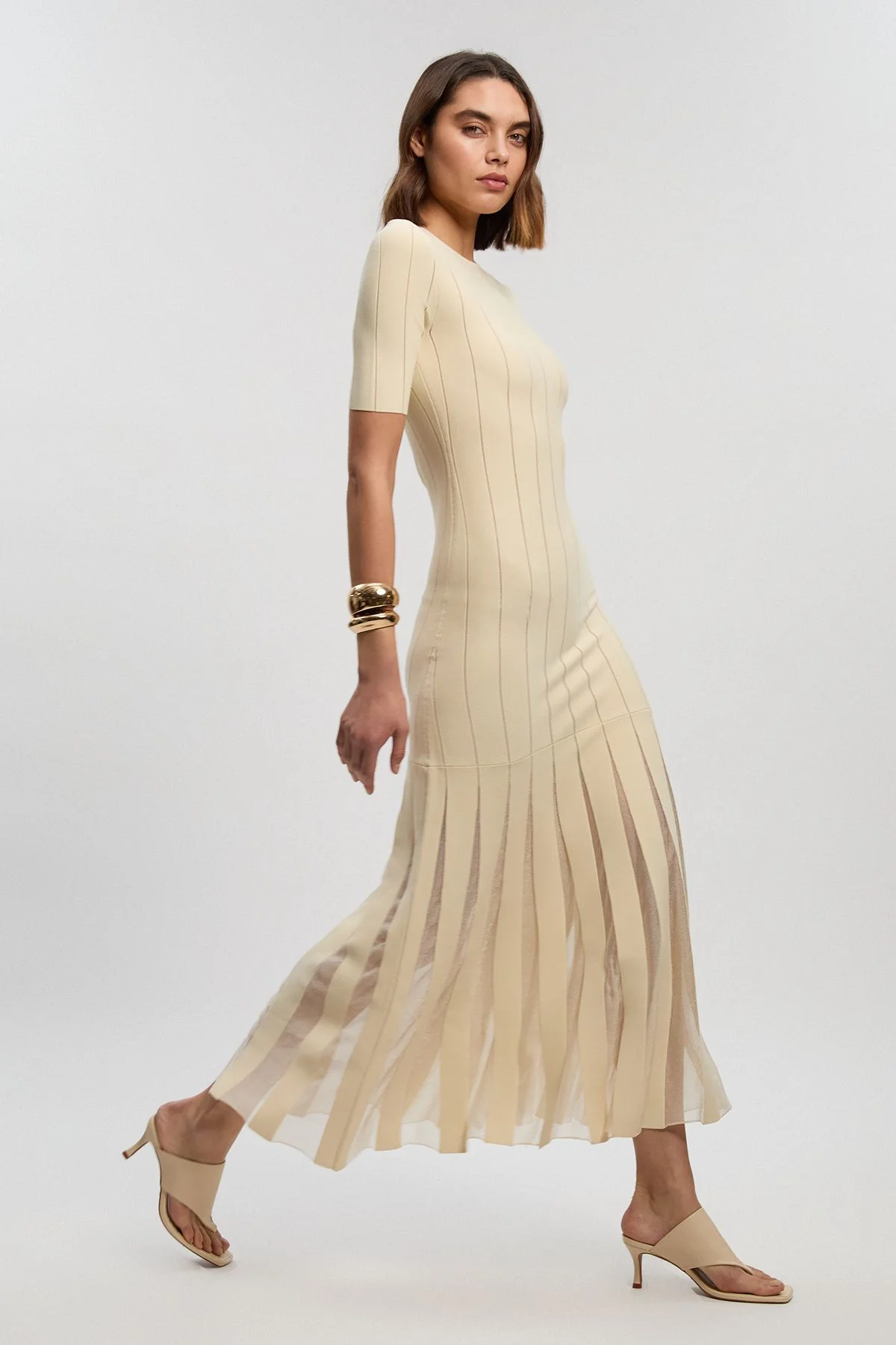 - Elegant knitted midi dress with a sophisticated full skirt design - Short sleeves and round neckline create a refined silhouette - Striking sheer panel detailing throughout the skirt adds contemporary interest - Figure-defining silhouette with a fitted bodice transitioning into a flowing skirt - Versatile 127cm length sits elegantly at mid-calf This exquisitely crafted knitted midi dress combines timeless elegance with modern design elements. The fitted bodice creates a flattering shape while the full skirt with sheer panels introduces movement and visual intrigue. Perfect for daytime engagements, style with minimal accessories as shown - delicate earrings and strappy sandals create an effortlessly sophisticated look. This versatile piece transitions beautifully from office meetings to family gatherings or weekend brunches. For cooler days, layer with a tailored blazer and ankle boots, or keep it casual with a denim jacket and white trainers. The viscose blend fabric offers comfort with a touch of stretch, ensuring you maintain both poise and ease throughout your day. A true wardrobe essential that embodies the Karen Millen ethos of contemporary refinement. Product Details & Care Main: 55% Viscose Filament, 43% Polyamide, 2% Elastane/Spandex; Contrast: 75% Polyamide, 25% Polyester Machine wash at 30°C cotton cycle, wash with similar colors, do not bleach, do not tumble dry, cool iron, do not dry clean, lightly steam to regain appearance. Models wears UK size Small. Models height approx 5"9. Length approx: 127cm.