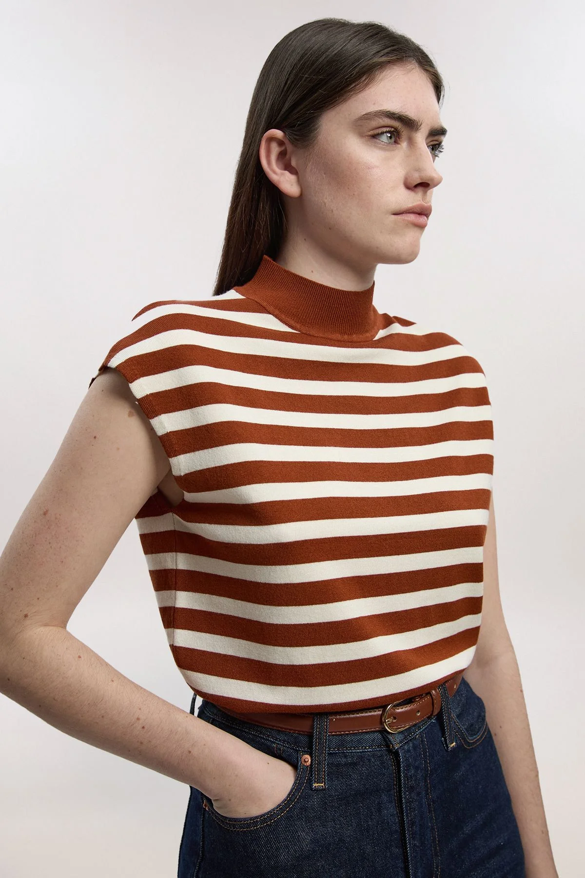 - Sleek high neck design creates a sophisticated silhouette - Striking stripe pattern offers timeless visual interest - Sleeveless tank style perfect for layering or wearing alone - Slim fit contours elegantly to the body - Viscose blend knit provides comfortable stretch and shape retention This high neck striped tank top embodies refined casual elegance. The sleek silhouette pairs beautifully with tailored trousers as shown, creating a balanced look that transitions effortlessly from office to evening. The knitted viscose blend offers a smooth finish with just the right amount of structure, while the timeless stripe pattern adds visual interest without overwhelming your ensemble. Layer under a blazer for meetings, or style with wide-leg trousers and statement earrings for dinner dates. For weekend sophistication, pair with high-waisted denim and a leather jacket. The versatile design works equally well tucked in for a polished appearance or left loose for a more relaxed feel. This tank top exemplifies Karen Millen's commitment to contemporary pieces with expert craftsmanship-a wardrobe essential that delivers both comfort and style. Product Details & Care Main: 70% Viscose/Rayon, 30% Nylon. Machine wash. Model wears UK size small. Model height: 5"9