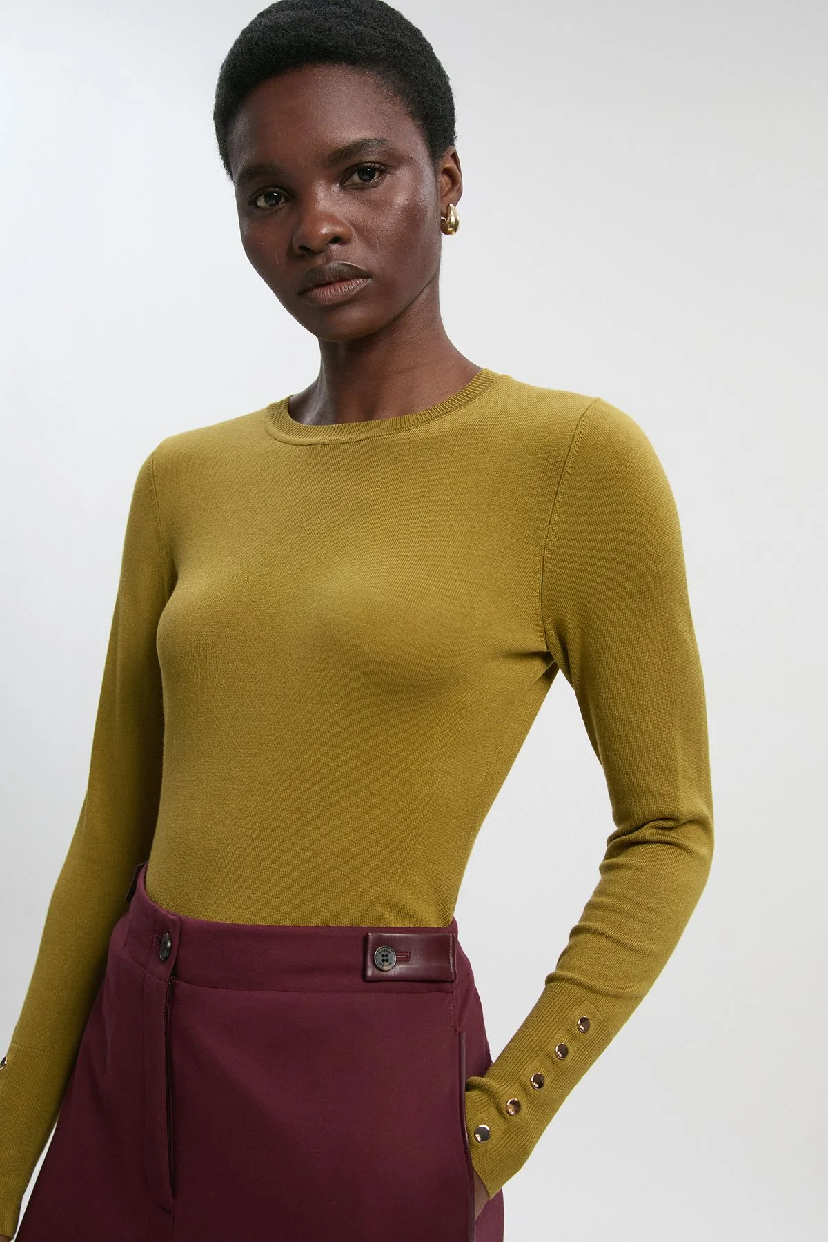 This Karen Millen crew neck jumper combines timeless design with contemporary details. The fitted silhouette creates a flattering shape that works when paired with contrasting textures, with the leather wrap skirt. The gold button detailing at the cuffs adds a touch of understated luxury to this everyday essential. The versatile nature of this piece makes it an ideal foundation for countless outfits throughout the seasons, easily transitioning from day to evening with simple accessory changes. Crew neck design Gold-tone button detailing at cuffs Slim fit silhouette Product Details & Care Main: 70% Viscose, 30% Nylon. Wash as wool. Model wears a UK size Small. Models height approx: 5"9. Length approx: 60cm