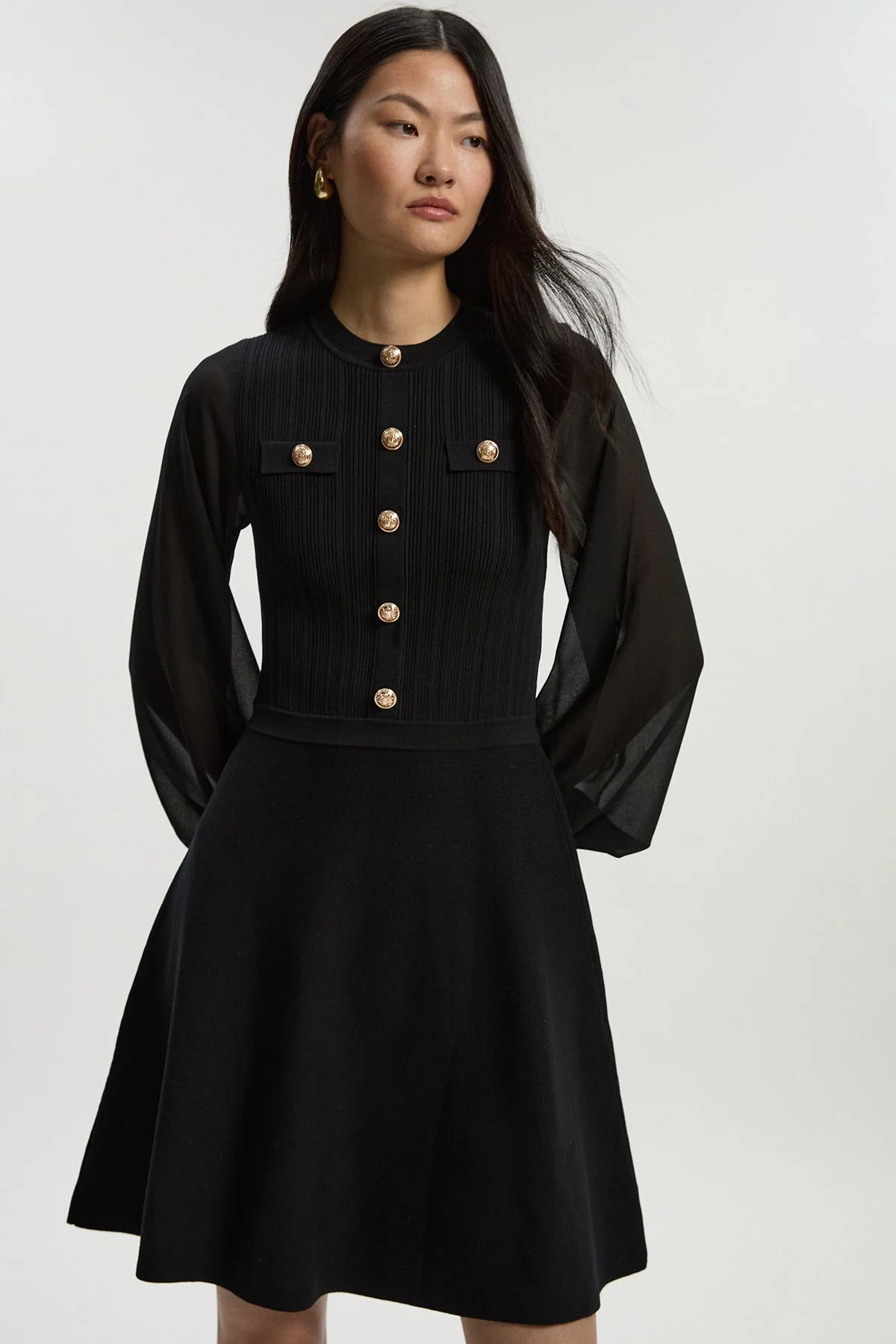 - Striking military-inspired gold button detailing along the front bodice - Elegant chiffon sleeves creating a beautiful contrast with the knitted body - Flattering crew neckline complemented by a fitted bodice - Flared mini skirt silhouette for a feminine, playful shape - Versatile viscose blend fabric offering comfort with structure This Karen Millen mini knit dress combines contemporary sophistication with subtle military influences. The structured bodice with decorative gold buttons creates a commanding presence, while the flowing chiffon sleeves add movement and femininity to the silhouette. Perfect for daytime engagements, style with ankle boots and a leather crossbody bag for family gatherings or weekend brunches. For a more polished daywear look, layer with a tailored blazer and pair with ballet flats. The versatile design transitions effortlessly from office to casual outings-simply swap your footwear and accessories to refresh your look. This piece embodies the Karen Millen ethos of expert craftsmanship and contemporary elegance, making it an essential addition to your daywear collection that will serve you through multiple seasons. Product Details & Care Main 53% Polyamide, 47% Viscose/Rayon. Contrast 100% Polyester. Wash with similar colours. Do not bleach. Do not tumble dry. Model wears UK size Small. Models height approx: 5"9. Item Length approx: 89cm.