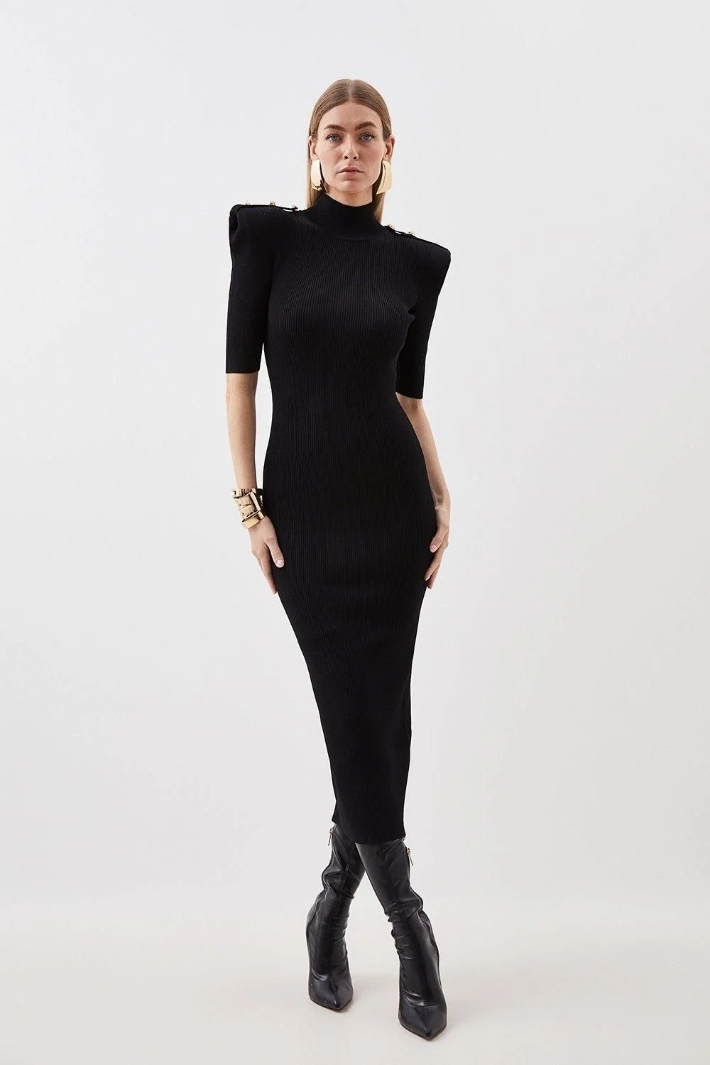 Viscose Blend Rib Knit Power Shoulder Military Trim Maxi Dress