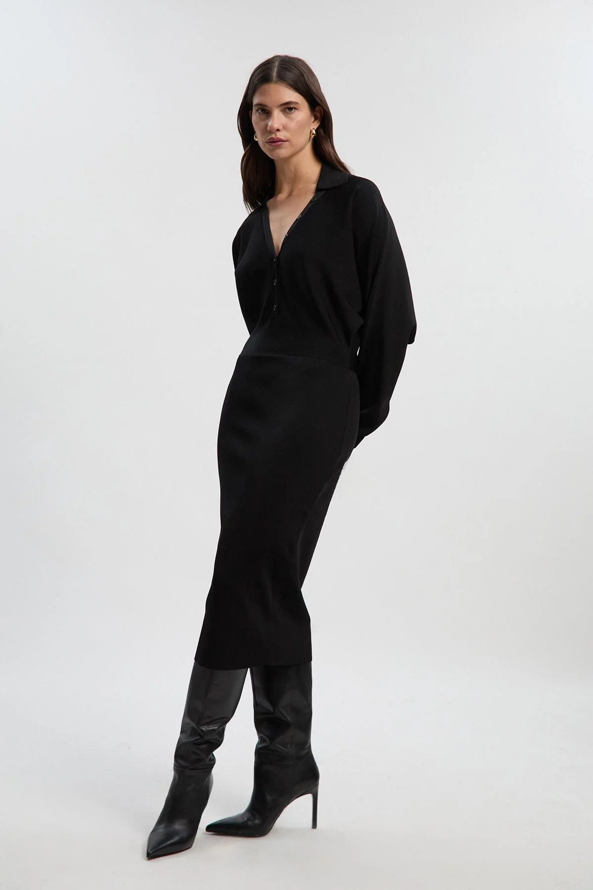 Viscose Blend Slinky Batwing Button Neck Knit Midi Dress