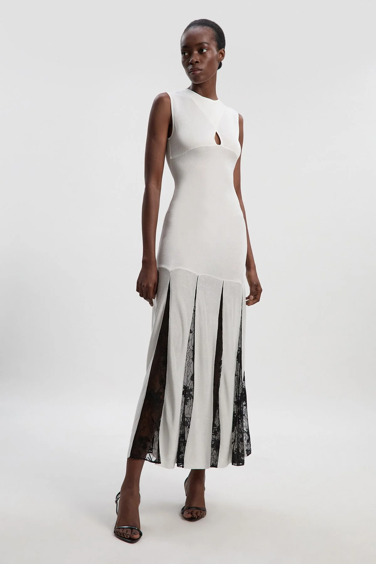 - Sleek slinky knit design with elegant maxi length for sophisticated silhouette - Delicate sheer lace detail at the hemline creates dramatic movement and texture - Subtle keyhole detail at the neckline adds a refined touch of allure - Sleeveless cut showcases shoulders whilst maintaining formal elegance - Fitted bodice transitions beautifully into a flowing lace-detailed skirt This viscose blend maxi dress embodies contemporary sophistication with its sleek silhouette and thoughtful design elements. The slinky knit construction gracefully contours the figure before transitioning into an enchanting sheer lace skirt that creates mesmerising movement with every step. Perfect for formal occasions such as evening receptions, black-tie events or elegant weddings, this dress commands attention without overwhelming. Style with minimal jewellery to maintain its refined aesthetic - a pair of delicate drop earrings and a slim bracelet will complement without competing. Complete the ensemble with strappy heeled sandals as shown for a harmonious balance of grace and poise. The versatile design allows for seasonal adaptation - add a tailored blazer or structured cape for cooler evening events whilst maintaining the dress's sophisticated character. Product Details & Care Main: 100% Viscose. Trim: 100% Polyester. Cool hand wash only. Models wears UK size Small. Models height approx: 5"9. Length approx: 133cm.