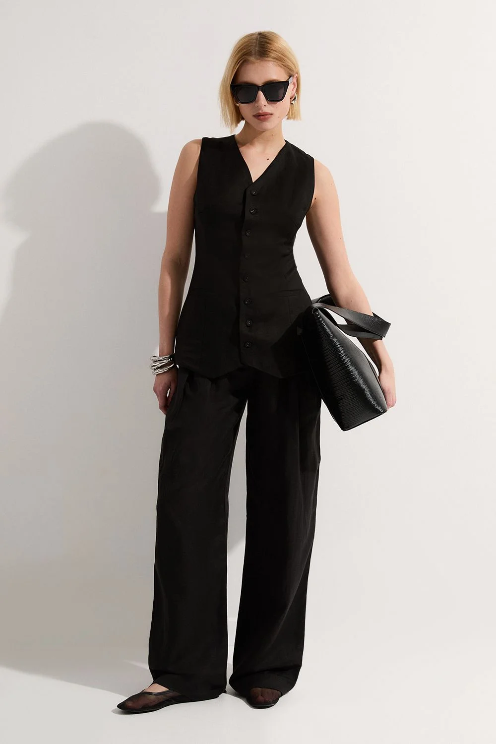 - Crafted from a breathable viscose linen blend for exceptional comfort and drape - Elegant pleat detailing adds sophisticated structure to the straight leg silhouette - Practical side pockets provide both functionality and a relaxed aesthetic - Wide leg design offers effortless movement and a contemporary profile - Versatile 82cm length sits perfectly with both flats and low heels These refined straight leg trousers combine timeless design with modern sensibility. The woven viscose linen blend creates a beautiful drape while maintaining structure through the pleated detailing. Style as seen with a sleek waistcoat and statement accessories for a sophisticated daytime ensemble that transitions seamlessly from office to weekend brunch. The wide leg silhouette pairs wonderfully with fitted tops to create balanced proportions, or try with an oversized knit for relaxed weekend styling. Perfect for family gatherings or casual lunch dates when paired with ballet flats and a structured tote. The practical pocket details add functionality without compromising on the clean lines that make these trousers a wardrobe essential for the discerning woman who values both comfort and polish. Product Details & Care 55% Linen. 45% Viscose/Rayon. Model wears UK Size 10/US 6. Model height is 5"9. Length measures 82cm.