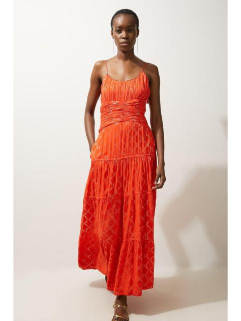 This Karen Millen sun dress radiates effortless sophistication with its intricate metallic thread pattern and thoughtful design details. The lightweight viscose fabric ensures comfort while maintaining a luxurious drape that moves with every step. Style with flat leather sandals and stacked gold bangles for daywear, or dress it up with espadrille wedges and statement earrings for summer occasions. The dress's distinctive pattern and flowing silhouette create a memorable look that stands out whilst remaining utterly wearable for numerous casual occasions throughout the summer months. Metallic thread detailing creating a shimmer effect Strappy design with delicate tassel ties Flattering empire waistline with ruched detailing Tiered skirt construction Full-length maxi cut Product Details & Care Shell: 89% Viscose/Rayon. 11% Metallised fibre/Metallic fibre. Lining: 100% Cotton.