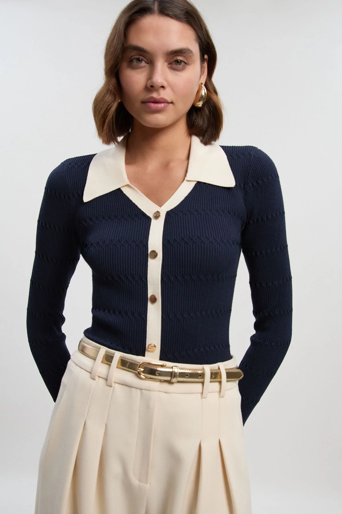 - Elegant rib stitch detail creates textural interest across the body - Contrast collar and cuffs add a sophisticated touch to this knit top - Decorative button-through front with stylish metallic buttons - Fitted silhouette showcases a flattering feminine shape - Versatile collared design transitions effortlessly from day to evening This Karen Millen viscose knit top combines contemporary design with timeless appeal. The distinctive rib stitch pattern creates beautiful texture while the contrast collar and cuffs offer a refined twist on a classic silhouette. Style with your favourite denim and a leather belt for casual weekend brunches, or tuck into a tailored trouser for a more polished daytime look. The button-through design allows for styling versatility-wear fully fastened for a more formal approach or leave a few buttons undone for a relaxed feel. Perfect for family gatherings or casual office environments, this piece embodies the sophisticated craftsmanship Karen Millen is known for. The fitted shape flatters the figure whilst maintaining comfort for all-day wear, making it an essential addition to your daywear collection. Product Details & Care 53% Viscose/Rayon, 27% Polyamide, 20% Polyester Machine wash at 30°C cotton cycle, do not bleach, do not tumble dry, cool iron, do not dry clean, wash with similar colours, dry flat away from direct heat and sunlight, keep away from fire. Models wears UK size Small. Models height approx: 5"9.