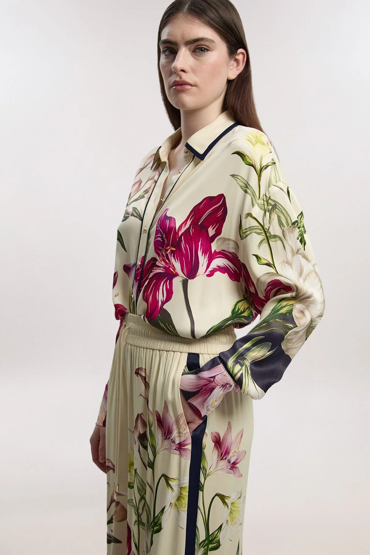 - Striking floral print viscose satin shirt with an oversized silhouette for effortless sophistication - Contrast navy collar trim adds a refined design element to the botanical pattern - Classic button-through fastening with a relaxed fit that drapes beautifully - Versatile woven fabric with a subtle sheen that catches the light - Generous 76cm length perfect for both tucked or untucked styling options This Karen Millen viscose satin shirt combines artistic floral prints with contemporary design for a piece that embodies polished daywear. The oversized fit creates a relaxed silhouette whilst maintaining an air of sophistication, perfect for the woman who appreciates expert craftsmanship. Style tucked into high-waisted denim jeans as shown for casual gatherings, or pair with tailored trousers for a smart-casual look that transitions effortlessly from day to evening. The contrast collar detail adds a distinctive touch that reflects the brand's attention to detail. For weekend brunches, layer under a lightweight cardigan with ballet flats, or dress up with statement earrings and loafers for family celebrations. The fluid drape of the fabric creates movement with every step, making this shirt a versatile addition to your wardrobe that works across multiple seasons. Product Details & Care 100% Viscose, wash with similar colours, wash inside out, iron on reverse whilst damp, Model wears UK 8/US 4. Model Height 5"9. Length approx: 76cm