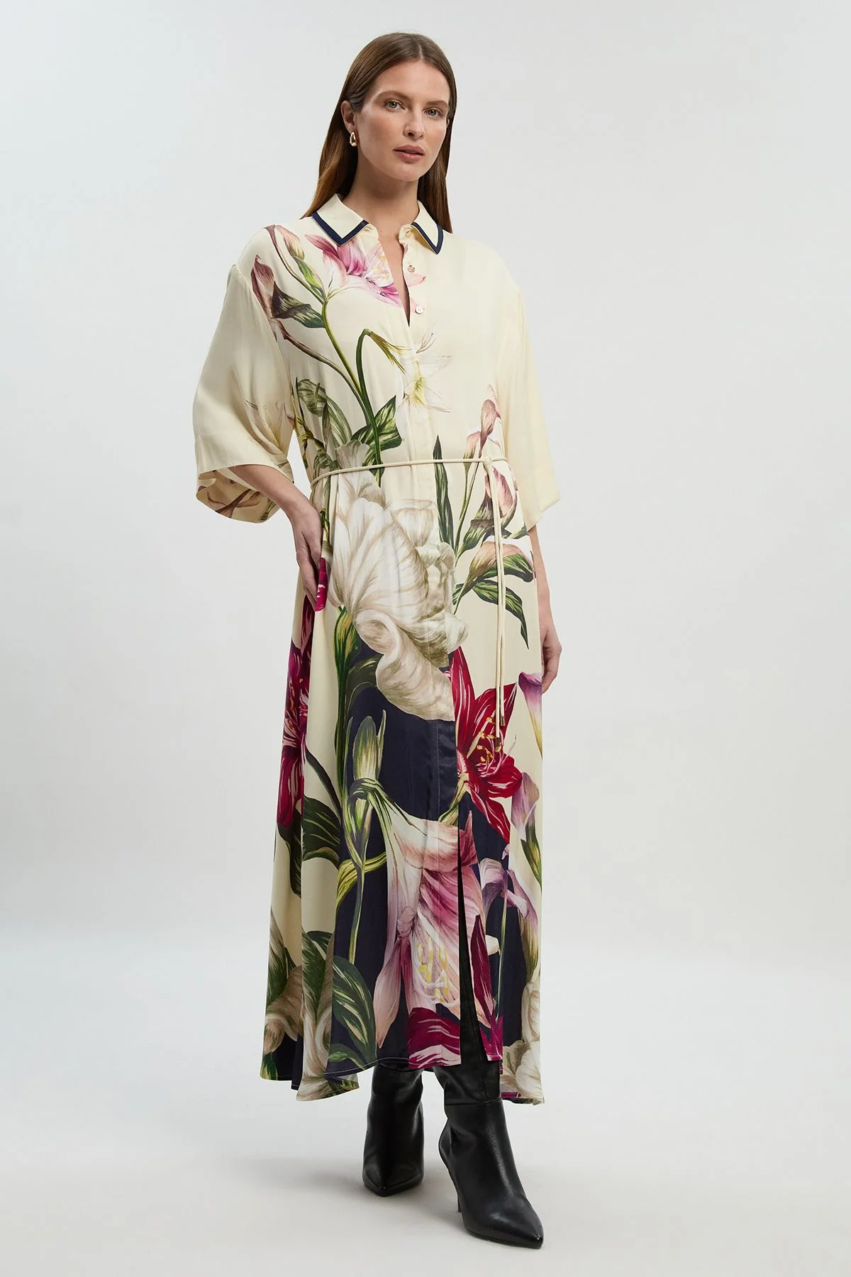 - Luxurious viscose satin fabric with striking floral print throughout - Oversized shirt design with classic collar and button-down front - Relaxed three-quarter length sleeves for effortless elegance - Flowing maxi length silhouette measuring approximately 138cm - Versatile woven construction offering graceful movement and drape This statement shirt dress from Karen Millen combines sophisticated tailoring with artistic flair. The oversized silhouette creates a relaxed yet polished aesthetic, while the viscose satin fabric offers a subtle lustre and exceptional drape that moves beautifully with every step. Style with ankle boots as shown for daytime sophistication, or pair with flat leather sandals and a woven tote for family gatherings. The botanical print makes this piece particularly suitable for garden parties or alfresco dining. For cooler days, layer with a lightweight cardigan or denim jacket to maintain the casual elegance. This versatile maxi dress transitions effortlessly from weekend brunches to casual office settings when paired with understated accessories, making it a cornerstone piece for the contemporary woman who values both comfort and refined style. Product Details & Care 100% Viscose, wash with similar colours, wash inside out, iron on reverse whilst damp, Model wears UK 8/US 4. Model Height 5"9. Length approx: 138cm