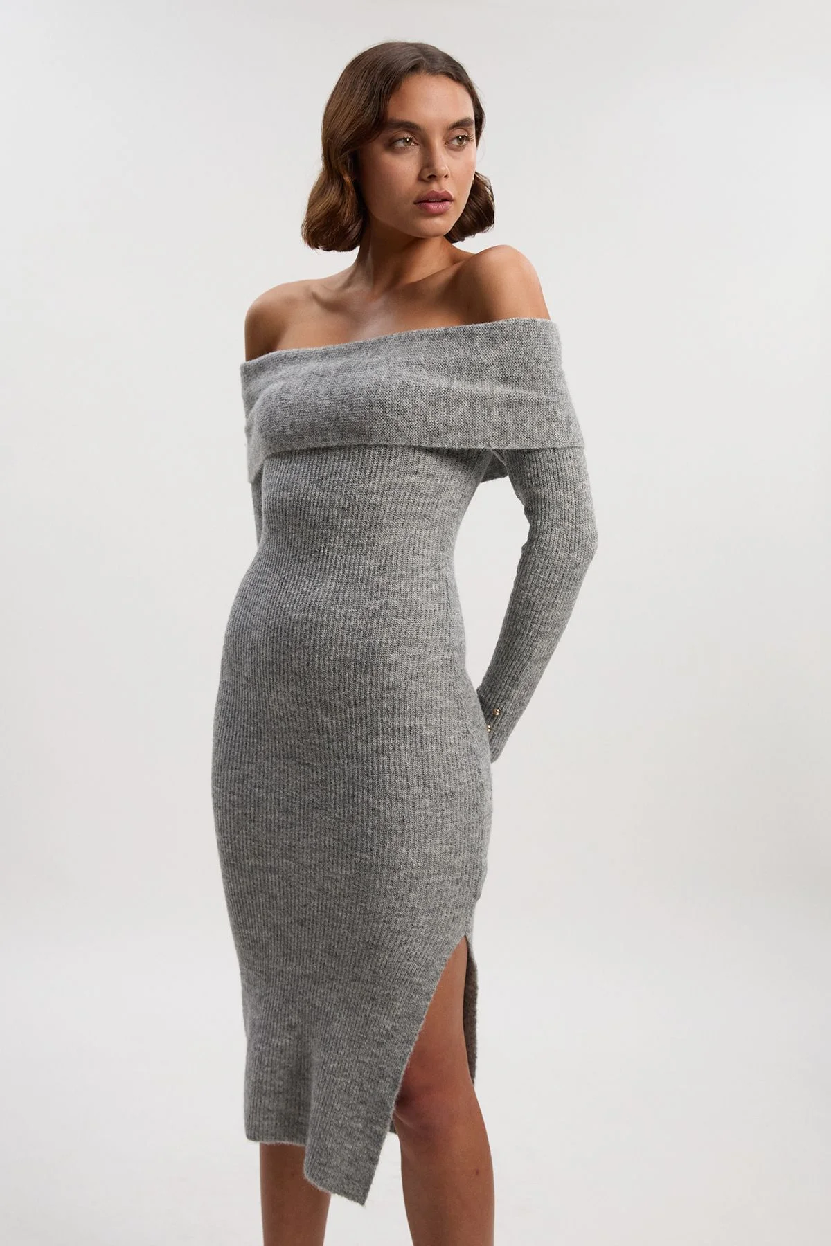 This Bardot knit midi dress embodies effortless sophistication for your daywear collection. The off-shoulder design showcases your decolletage whilst the cosy knit fabric ensures you remain comfortable throughout the day. The side split detail adds practical movement whilst maintaining the dress's sleek silhouette. This is a wardrobe essential that transitions seamlessly from day to evening with just a change of accessories. Bardot neckline with a fold-over detail Cosy knit fabric Midi length with subtle side split Decorative gold-tone button detailing Figure-hugging silhouette Product Details & Care Main: 76% Polyester, 15% Nylon, 6% Wool, 3% Elastane. 30 degree wool cycle. Model wears UK size Small. Models height approx: 5"9. Length approx: 115cm