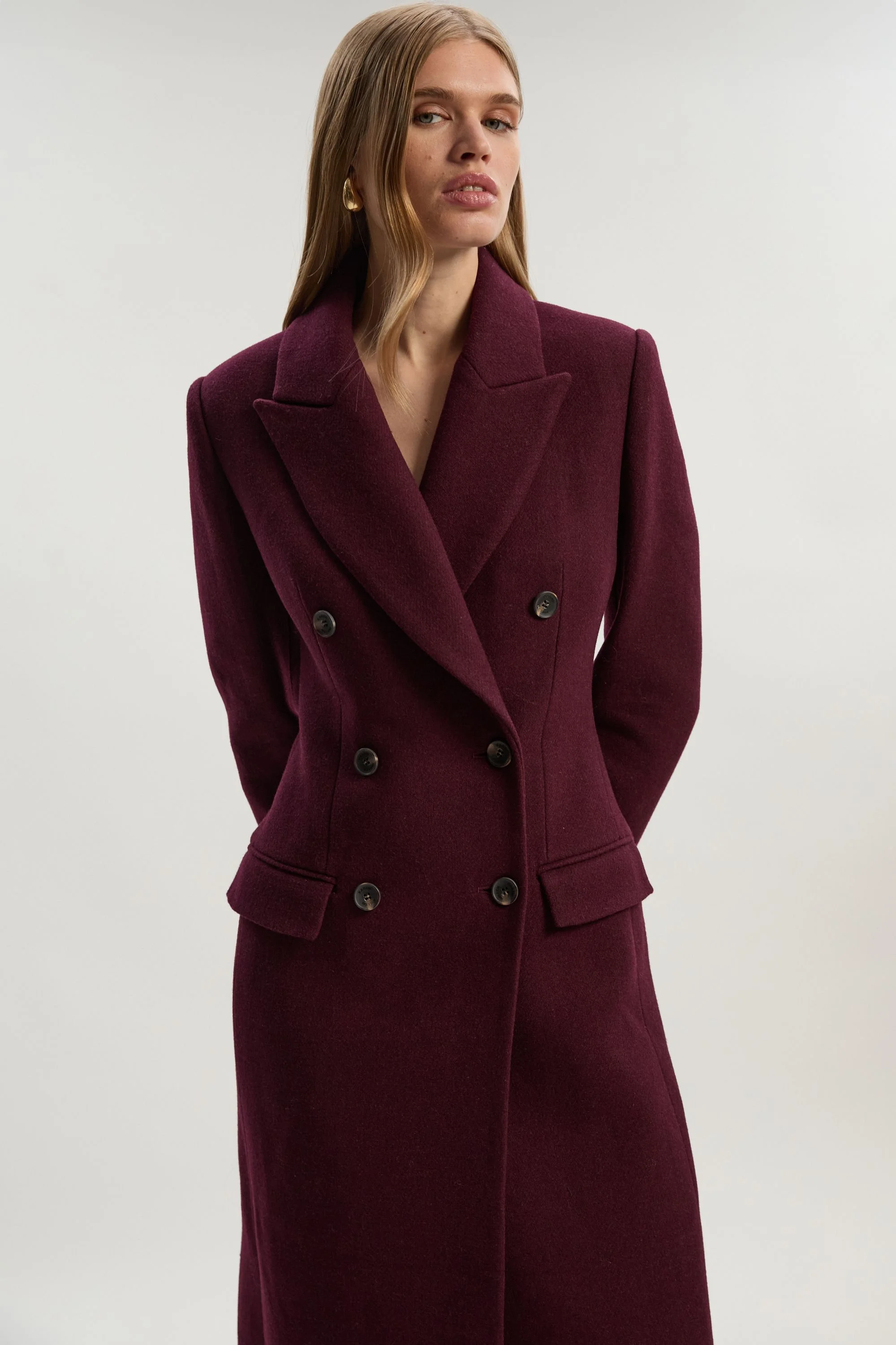 - Double-breasted design with elegant button fastening for a sophisticated silhouette - Tailored midi length offering versatile styling options and enhanced warmth - Structured collar that can be worn up or down for different looks - Wool-blend fabric providing excellent insulation during cooler months - Practical side pockets perfect for keeping essentials close at hand This double-breasted midi coat from Karen Millen embodies refined daywear with its impeccable tailoring and timeless design. The structured silhouette creates a polished appearance whilst maintaining comfort for everyday wear. Style with a turtleneck jumper and wide-leg trousers for a sophisticated daytime ensemble, or layer over a casual dress with ankle boots for family gatherings. The versatile length works beautifully with both midi skirts and slim-fit jeans, making it an adaptable piece for your autumn-winter wardrobe. For a contemporary weekend look, pair with straight-leg denim, a fine knit and trainers, adding oversized sunglasses for a touch of understated glamour. This coat reflects Karen Millen's commitment to expert craftsmanship, creating a piece that will remain a wardrobe cornerstone for years to come. Product Details & Care Main: 50% Polyester, 47% Wool, 3% Other fibres; Lining: 55% Polyester, 45% Viscose/Rayon Keep away from fire, dry clean separately, iron on reverse