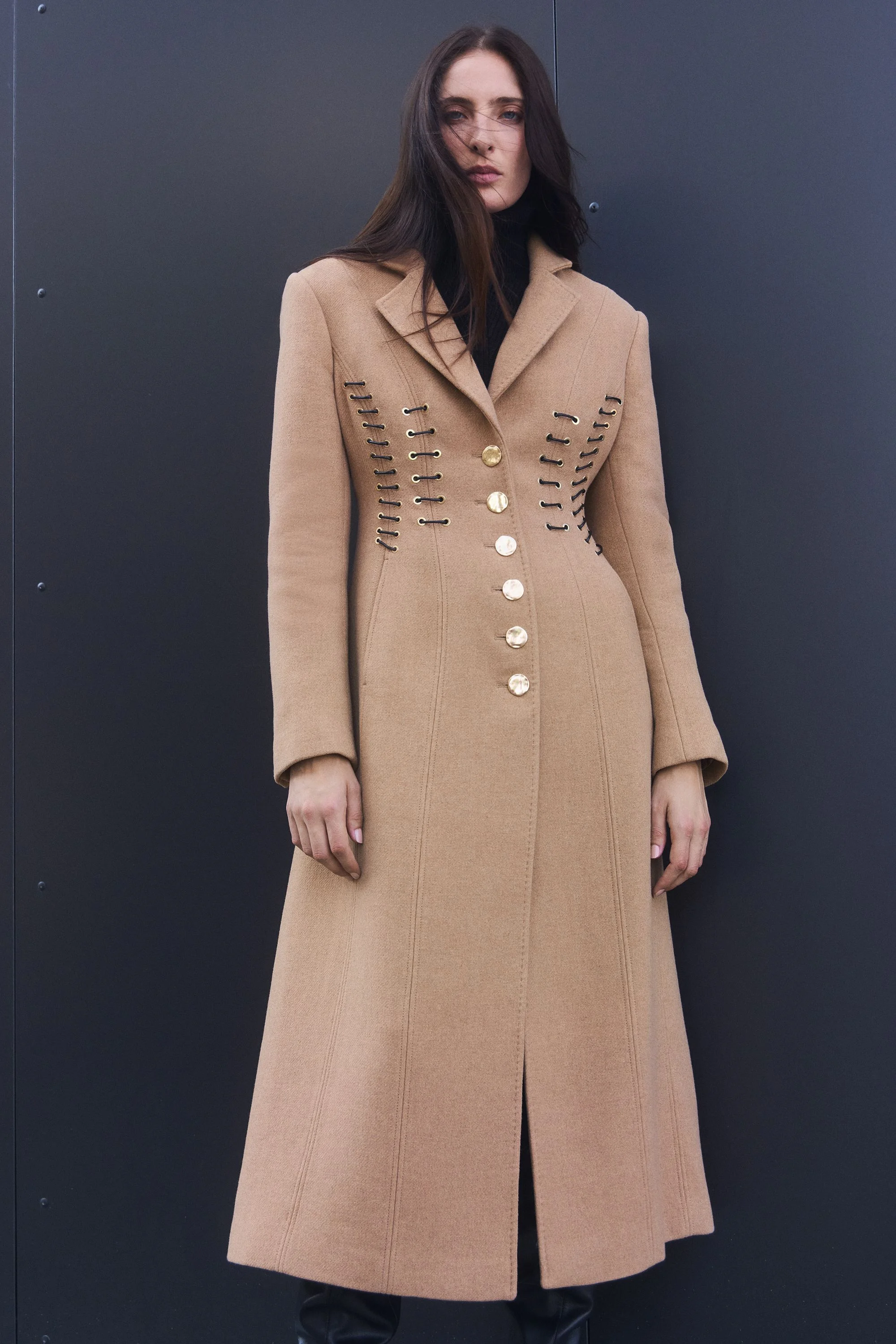 - Distinctive whip stitch detailing adds artisanal flair to this tailored midi coat - Statement gold-tone buttons create a military-inspired aesthetic - Side lace-up detailing offers adjustable silhouette and unique design element - Collared neckline provides structure and sophistication - Regular fit with midi length ensures versatile styling options for various body types This Karen Millen wool blend coat combines timeless tailoring with contemporary design elements for the discerning modern woman. The striking side lace-up detailing and polished gold-tone buttons create a distinctive silhouette that commands attention, whilst the midi length offers practical warmth without compromising on style. Style with a sleek turtleneck and tailored trousers for sophisticated daywear, or layer over a casual knit dress with ankle boots for family gatherings. The versatile regular fit accommodates light layering underneath, making it ideal for transitional weather. This coat effortlessly bridges the gap between functional outerwear and fashion statement piece, perfect for the woman who appreciates expert craftsmanship and thoughtful details in her everyday wardrobe. A true investment piece that will serve as the cornerstone of your autumn and winter wardrobe for years to come. Product Details & Care Main: 50% Polyester, 47% Wool, 3% Other fibres. Lining: 45% Polyester, 55% Viscose/Rayon. Model wears: UK8 / US4. Model height: 5"9. Approx length: 137cm