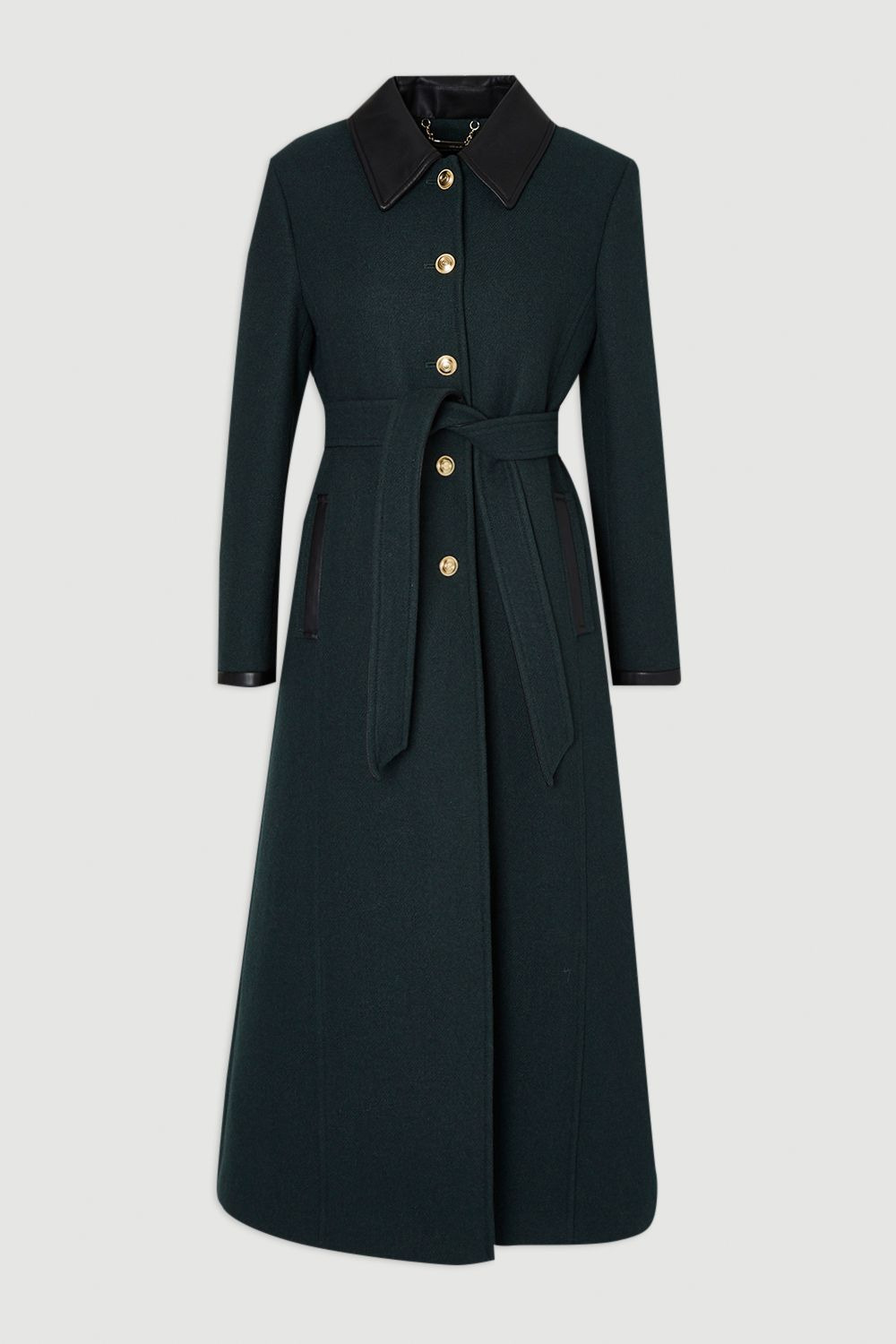 This statement Karen Millen coat combines timeless tailoring with modern design elements for a truly versatile outerwear piece. The structured silhouette creates a refined profile while the contrasting PU leather details add contemporary edge to the classic wool blend fabric. The belted waist allows for customised styling. Wear cinched to define your silhouette or slightly looser for a more relaxed feel. Perfect for transitional weather and colder months, this coat offers both practicality and sophistication for everyday wear while making a confident style statement. The maxi length provides extra warmth and dramatic flair that will transform even the simplest of outfits. Maxi-length silhouette Wool blend fabric PU leather collar and belt Gold-tone button detailing Practical side pockets Product Details & Care Main 1 : 50% Polyester. 47% Wool. 3% Other fibres. Main 2: 100% Polyurethane. Lining: 55% Polyester. 45% Viscose/Rayon. Iron on reverse. Model wears UK Size 8/ US Size 4. Model height approx: 5"9. Length approx: 135cm
